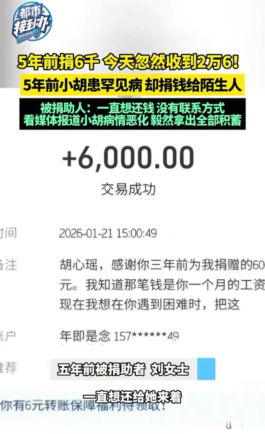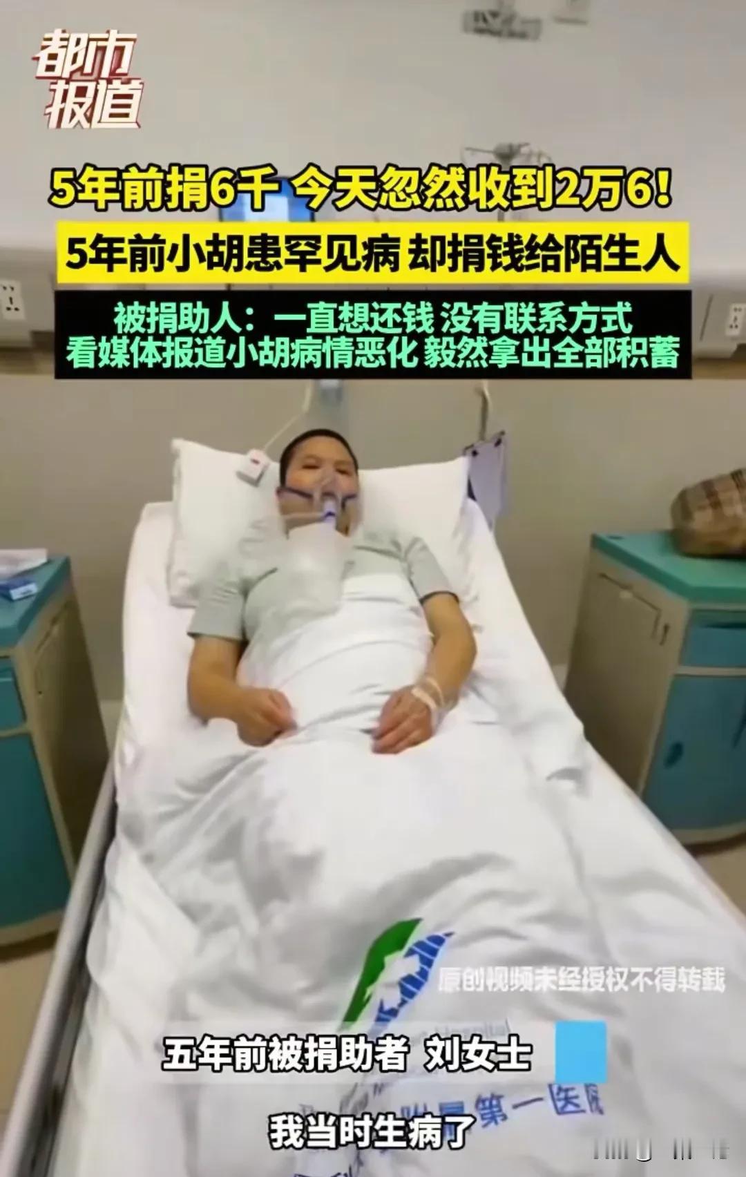 重庆,18岁女子,领到第1笔工资8000元,不顾自己生病,给更加病重的陌生人捐了6000元,5年后,女子病重,这笔6000元回来了,带着2万元的利息,还钱的陌生人说:这一次换我守护你的平安。 5年前,才18岁的小胡,她找到了一份非常不错的工作,一个月就有8000元,可她领到的第1笔工资,居然就捐出去了6000元。 那时,小胡得知自己的一个客户,病重了,急需用钱,她就非常的着急,善良的她,深知生病的无奈和痛苦。 她从14岁起,其实就患了罕见病,她一直都和自己身上的病抗争着,一边努力工作,一边努力看病。 那时她得知客户的病比她还要严重,她就非常的着急,毫不犹豫地就给这个客户6000元,这是她的第1笔工资,捐助之后,她又一头扎进工作中,忘了这件事。 5年时间过去了,小胡的病情却不容乐观,她的病接近晚期了,如果不抓紧时间治疗,情况危在旦夕,她不得不躺在病床上,继续和自己身上的病抗争。 此刻的她,承受着病痛带来的折磨,也承受着医疗费的压力。 要治病,就得花钱,才23岁的她,工作才几年时间,这几年,她一直在花钱治病,身上已经没有了多少积蓄。 躺在病床上的她,一边痛苦着,一边焦虑着,就在她不知所措时,一笔转款,让她震惊了。 有一个陌生人,居然给她转了26,000元,这个人她根本不认识,怎么会有人无缘无故,给她转这么多钱治病呢? 原来,当年她捐助的6000元,受助人是刘女士,刘女士当时病重,得到小胡捐助的这6000元,让她顺利度过了难关,重获了健康。 当她得知,给她捐助6000元的是一个18岁的小姑娘,这6000元还是她一个月的工资,她当时非常感动,病好了之后,一直想找机会还这6000元,可她想还钱才发现,她根本没有小胡的联系方式,甚至连小胡的名字都不知道。 直到小胡病重,她的事情被报道出来,她这才一眼认出小胡,就是这个善良的姑娘,在她还年少时,用她的第1桶金帮助了她。 如今刘女士已经康复,看到曾经救助过自己的姑娘,现在深受病痛的折磨,她焦急万分,这一次,她要守护这个善良姑娘的平安。 她毫不犹豫地将自己身上所有的钱,26,000元,全部转给小胡,她希望小胡能够渡过难关,继续欣赏这美丽的世界。 当小胡看到这26,000元,她这才想起了5年前的这件事,她没想到,好人真的有好报,那6000元回到她身边了,带着2万元的利息守护着她的平安。 这是一个动人的故事,6000元的背后,承载的是小胡的善良,26,000元的背后,承载的是滴水之恩,涌泉相报。 5年前,小胡的这6000元,切切实实地帮助了刘女士,或许小胡的这一个善举,照亮了刘女士当时的路。 如今小胡深处病痛中,刘女士的26,000元,也同时照亮了小胡的路。 小胡说,在她的病临近晚期,她得到了老师,同学,朋友的帮助,就连曾经救助过的人,也倾囊相助。 她要努力活着,生活多一天,就能多感受美好的一天。 不管是小胡捐助的6000元,还是刘女士捐助回的26,000元,这都是道义上的捐赠,是不可以撤回的。 《民法典》第658条第1款规定:赠与人在赠与财产的权利转移之前可以撤销赠与,这被称为任意撤销权。不过,此权利存在适用范围限制,不适用于经过公证的赠与合同或具有救灾,扶贫,助残等公益,道德义务性质的赠与合同。 其实善良的小胡捐赠6000元时,并没有想过要刘女士返还,如今刘女士捐助26,000元,她同样也没有想过要小胡返还,她们只想让自己的善良点亮他人世界。 那么你对善良的小胡和刘女士有何感想?