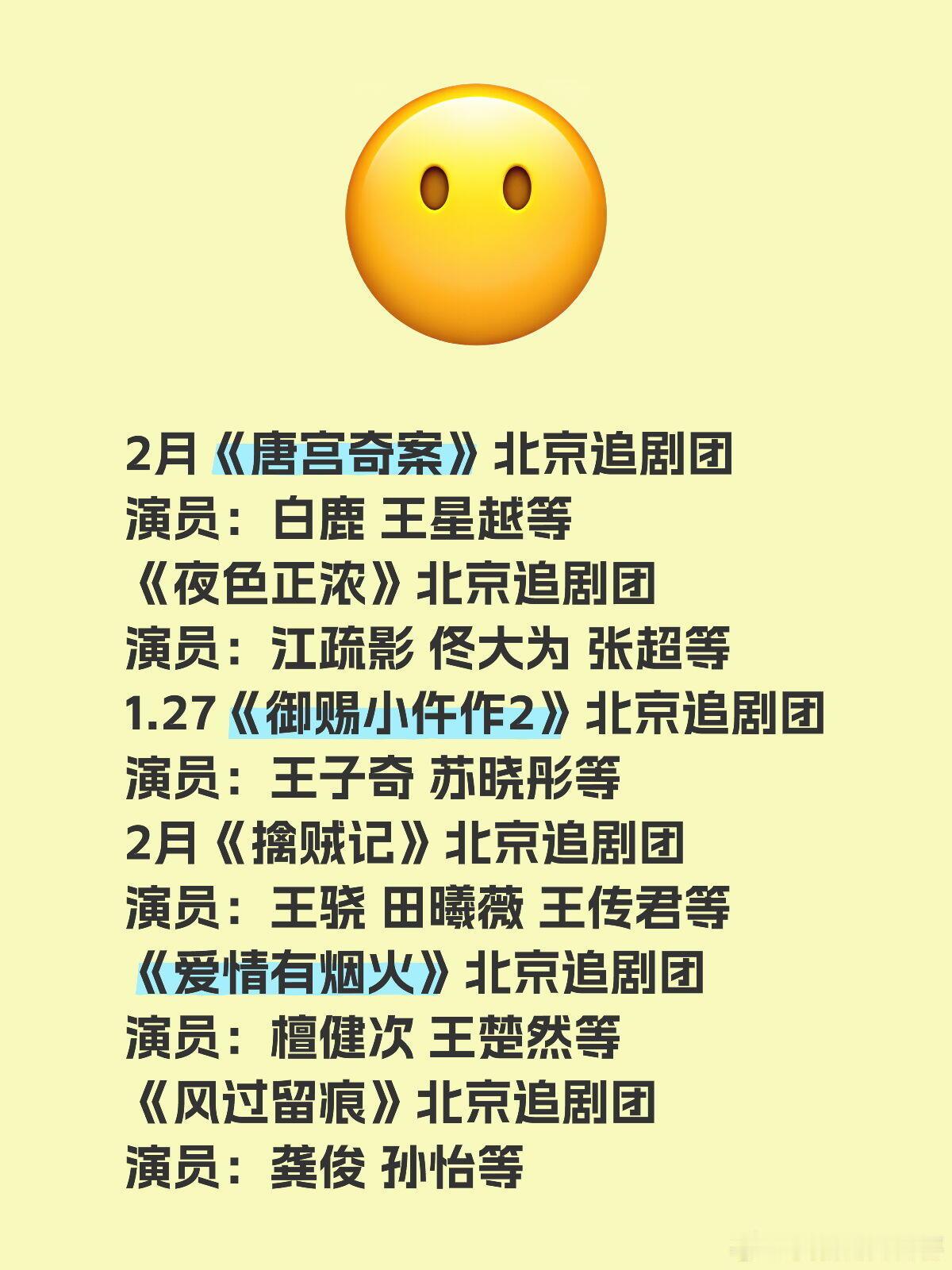 2月《唐宫奇案》北京追剧团演员:白鹿 王星越等《夜色正浓》北京追剧团演员:江疏影 佟大为 张超等1.27《御赐小仵作2》北京追剧团演员:王子奇 苏晓彤等2月《擒贼记》北京追剧团演员:王骁 田曦薇 王传君等《爱情有烟火》北京追剧团演员:檀健次 王楚然等《风过留痕》北京追剧团演员:龚俊 孙怡等