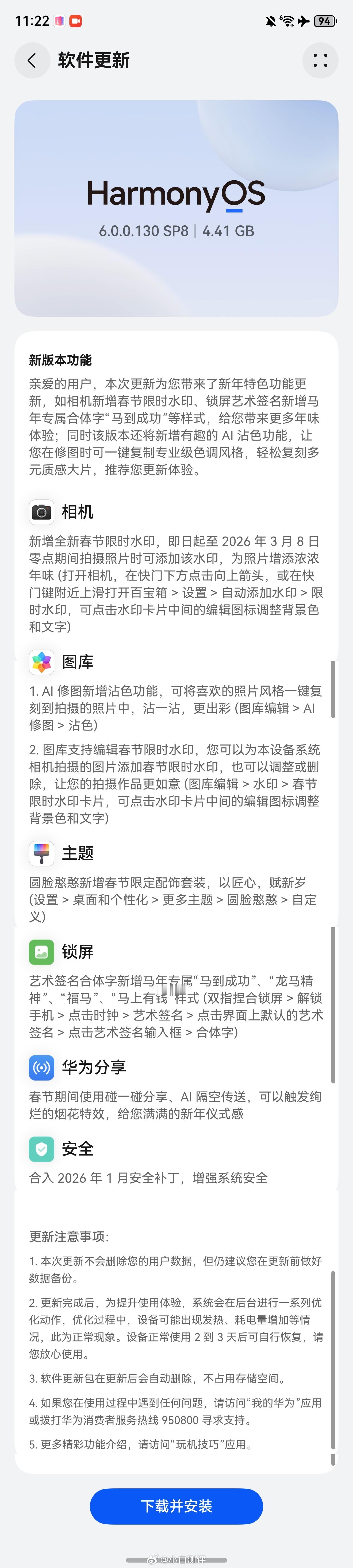 华为Mate 80 Pro Max系统更新来了4.41GB大包春节限时水印上线另外AI修图新增沾色功能还有一些新春相关元素~