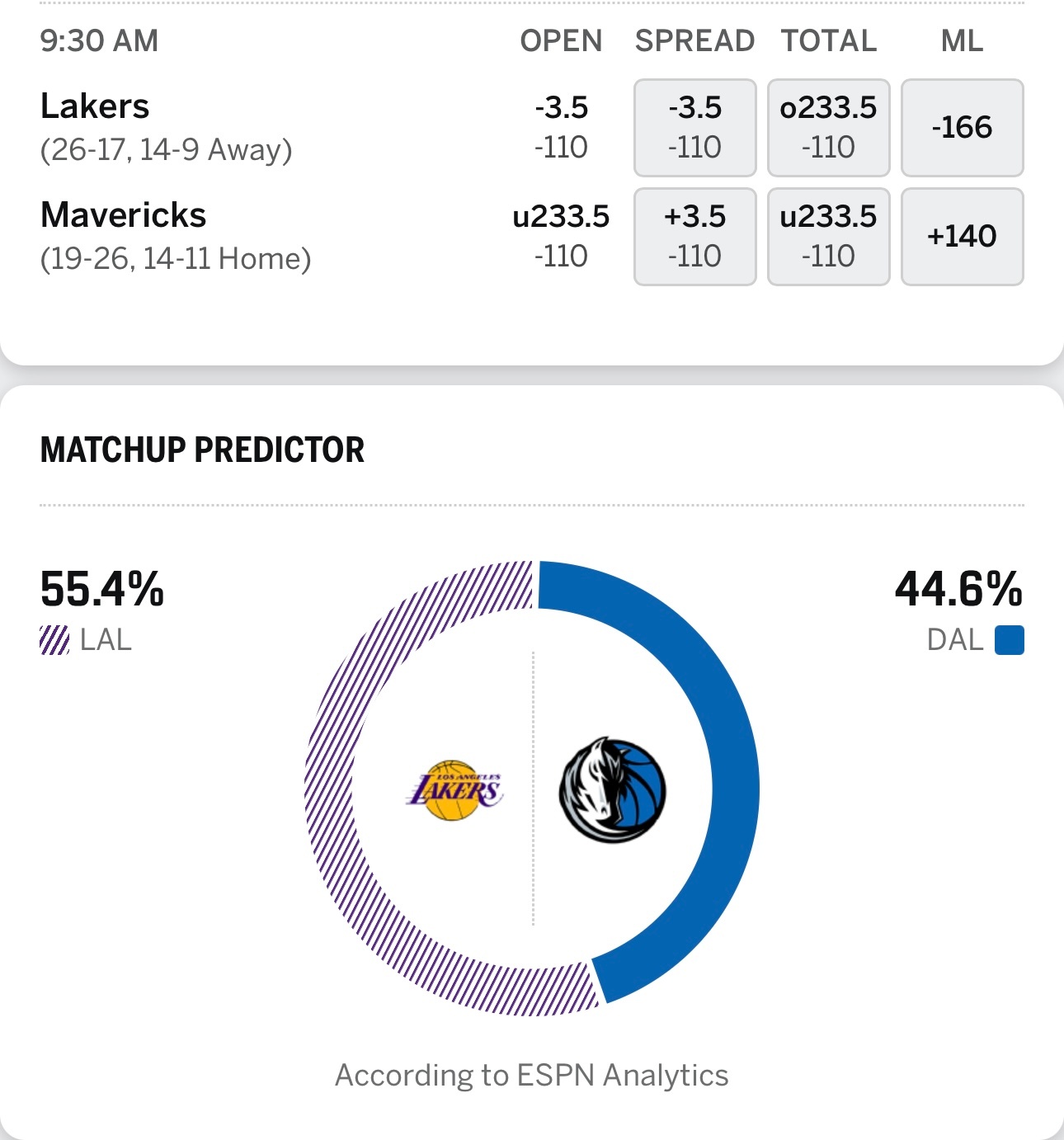 明天早上9点半,湖人客场打独行侠,ESPN预测湖人胜率55.4%,东契奇第二次回到达拉斯,湖人能否避免连败?