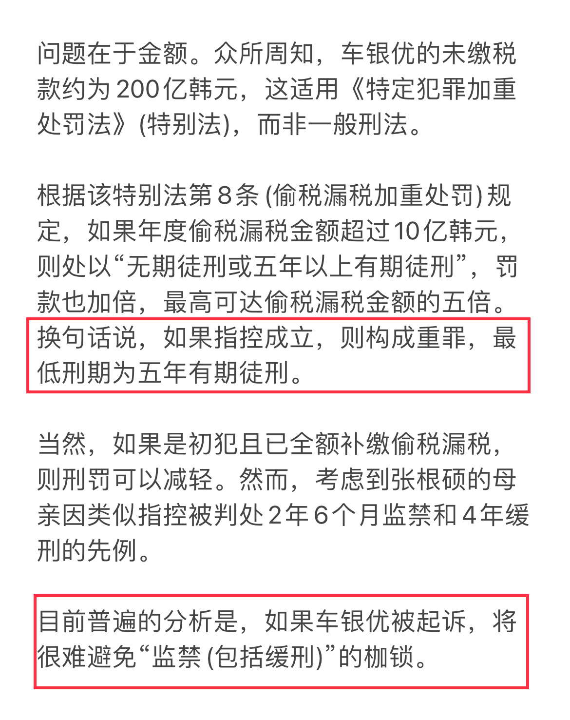 车银优若被判逃税罪名成立,将面临至少五年有期徒刑,被起诉则很难避免被监禁。D社曝车银优至少赚了1000亿韩元