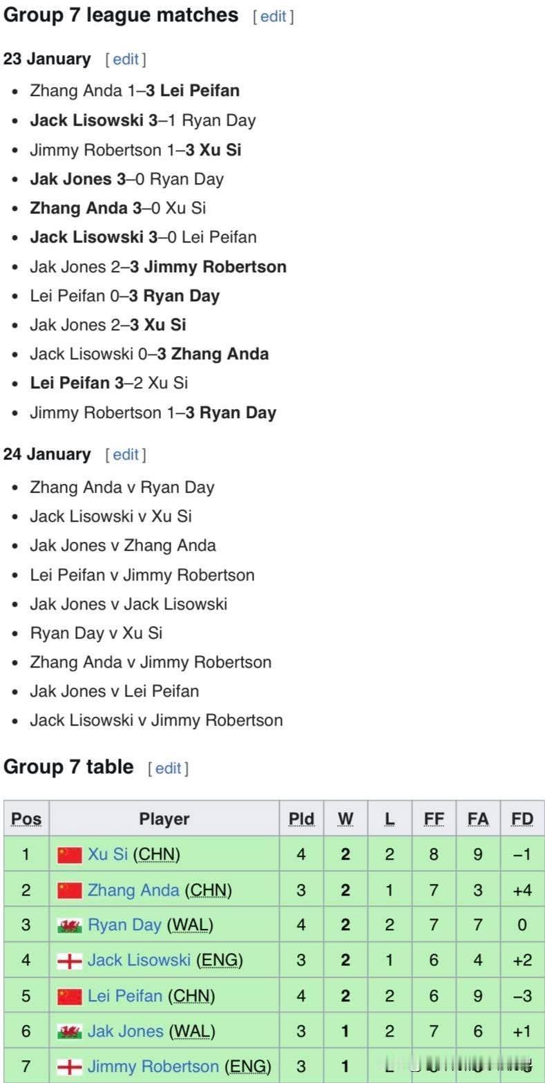 斯诺克冠军联赛第7组赛果(1月23日 ): 张安达 1-3 雷佩凡 杰克·利索夫斯基 3-1 瑞恩·戴 吉米·罗伯逊 1-3 徐思 杰克·琼斯 3-0 瑞恩·戴 张安达 3-0 徐思 杰克·利索夫斯基 3-0 雷佩凡 杰克·琼斯 2-3 吉米·罗伯逊 雷佩凡 0-3 瑞恩·戴 杰克·琼斯 2-3 徐思 杰克·利索夫斯基 0-3 张安达 雷佩凡 3-2 徐思 吉米·罗伯逊 1-3 瑞恩·戴 1月24日赛程 张安达对阵瑞恩·戴 杰克·利索夫斯基对阵徐思 杰克·琼斯对阵张安达 雷佩凡对阵吉米·罗伯逊 杰克·琼斯对阵杰克·利索夫斯基 瑞恩·戴对阵徐思 张安达对阵吉米·罗伯逊 杰克·琼斯对阵雷佩凡 杰克·利索夫斯基对阵吉米·罗伯逊 徐思和雷佩凡都是两胜两负,后者赢了两场德比,但对外被利索夫斯基和瑞恩·戴零封。 目前,徐思和张安达暂列小组前两位,但变数依旧很大,今晚将决出小组冠军。