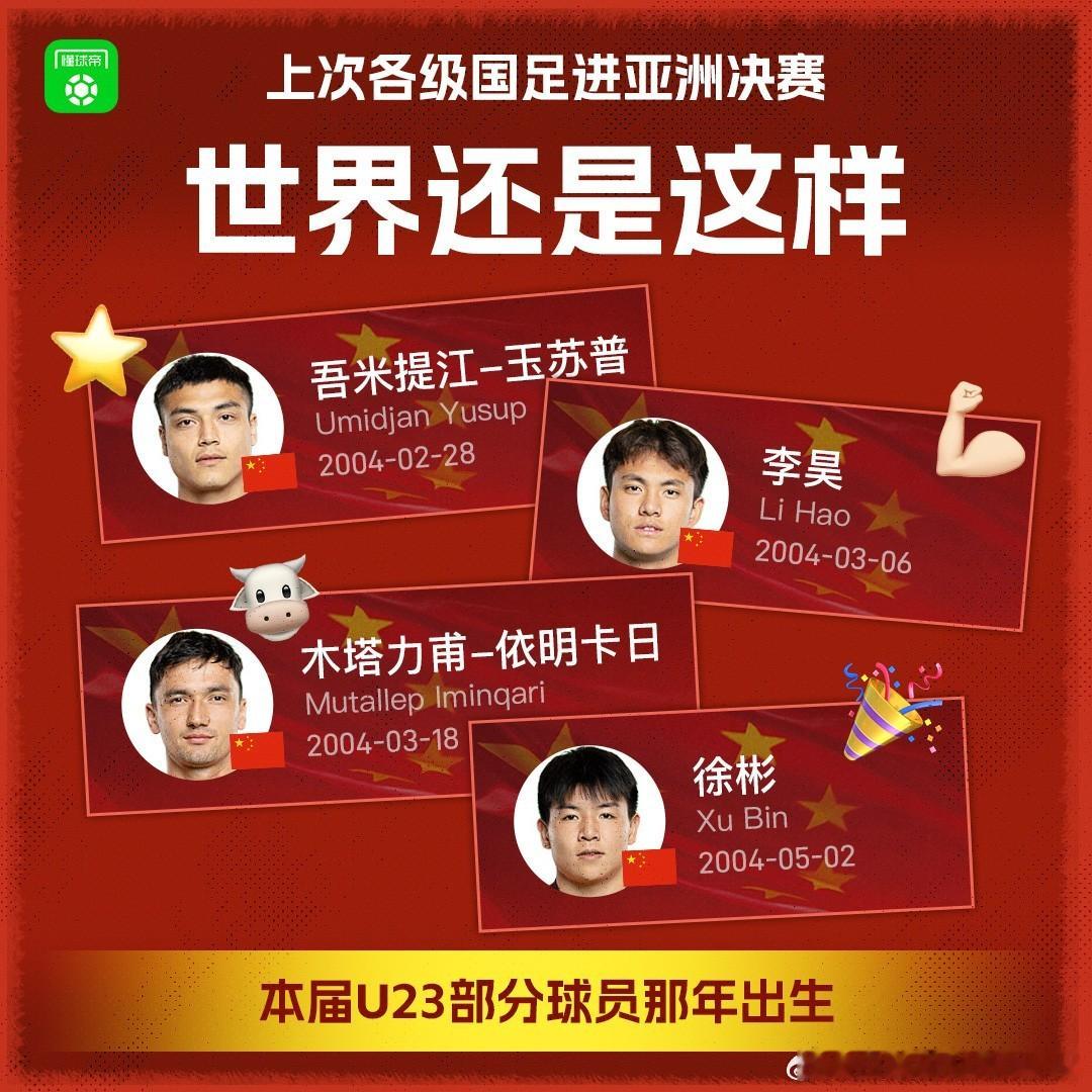 上次各级国足进决赛(因为日本手球进球输掉的决赛)的时候有:马大帅、七里香、刘翔奥运冠军、希腊神话欧洲杯夺冠、阿森纳不败夺冠吾米提江、徐彬等球员刚刚出生,但这支U23对内仍有多达11位球员尚未出生 u23国足 u23国足今晚争冠