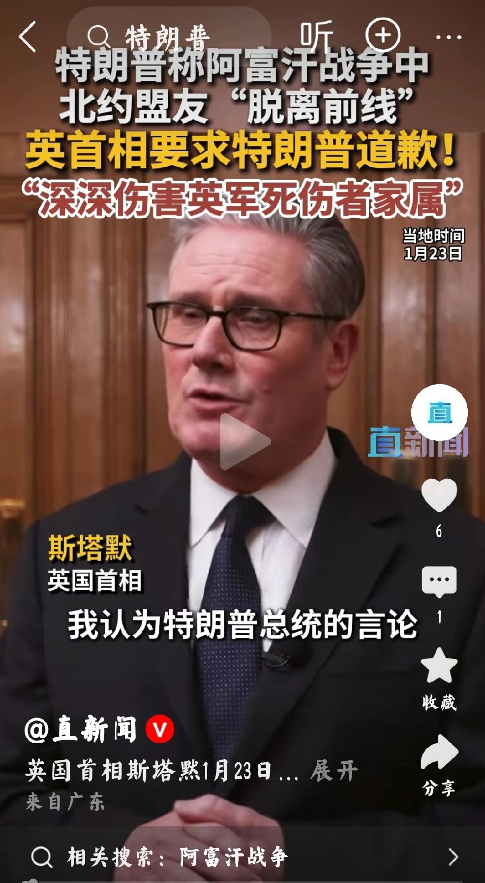 当地时间1月23日,特朗普宣称阿富汗战争中,北约盟友脱离前线。英国首相要求特朗普道歉,深深伤害英军死伤者家属。 个人认为:美国狂虐英国,又何妨?英国人的膝盖早就跪在了白宫的草坪上。 不用担心,英国像极了受虐狂一般。不用担心,英国反而享受美国人施虐的过程。英国坚定不移的与美国站在一起。
