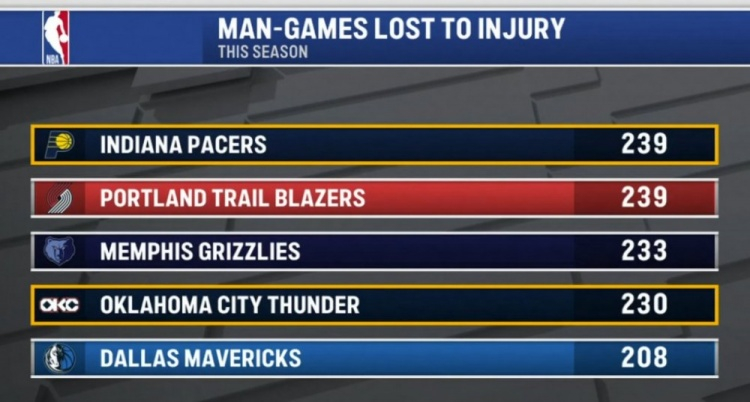 #开拓者步行者受伤者#联盟统计本赛季NBA伤病人次:步行者&开拓者239次并列