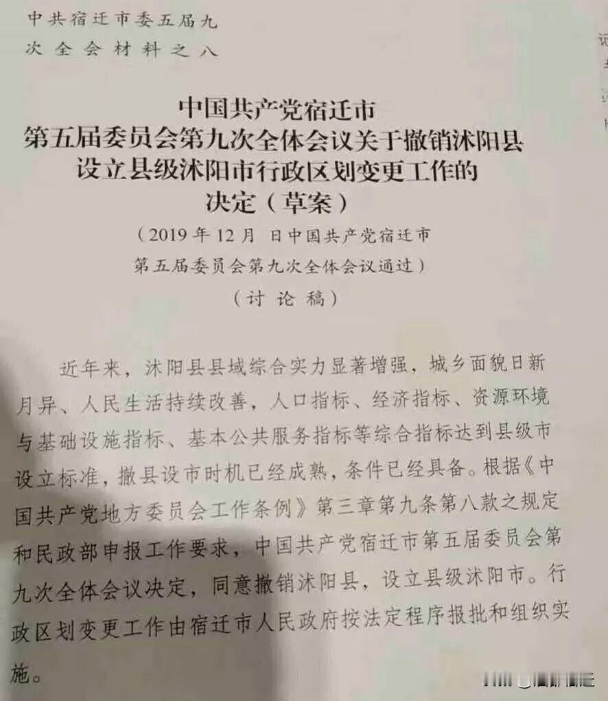 部分沭阳网友认为宿迁市阻碍了沭阳撤县设市,实则不然!2019年12月,宿迁市委通过了《撤销沭阳县设立县级沭阳市的决定》,完成了市级申报程序。然而,此后撤县设市工作确实未取得明显进展,主要受国家政策收紧、自身部分指标未达标准等因素影响,具体情况如下: 审批政策收紧:2016年规定,申报设立县级市的请示需一件一报,同一省级人民政府申报的请示在未出办理结果前,原则上不得呈报新请示,这导致各地审批进程放缓。 自身指标未达标:沭阳县2024年GDP达1560.39亿元,但人均GDP过低,城镇化率仅52.3%,低于全国平均水平,与拟设市区域常住人口城镇化率位居本省所辖县前30%以内或不低于全国平均水平的标准有差距! 鉴于上述原因,自2019年宿迁市委通过相关决定后,沭阳县撤县设市工作因审批流程等因素陷入停滞,至今未有省级及以上审批动作。