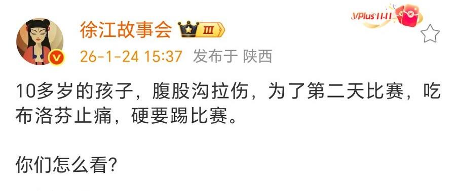 老二腹股沟受伤,董路让吃布洛芬不要耽误比赛?博主:加泰罗尼亚青少年社区比赛而已! 有人截取了董路社媒视频,董路表示:老二吕孟洋腹股沟疼。一抬腿就疼,赶紧联系让看医生,不行呢吃个布洛芬,今天晚上必须得干呢? 知名足球媒体人徐江表示:“10多岁的孩子,腹股沟拉伤,为了第二天比赛,吃布洛芬止痛,硬要踢比赛。” 而博主“我也在西班牙”表示,就是加泰罗尼亚青少年社区比赛而已,又不是国足U23,有必要吗? 当然视频是不是还有后半段,希望就是可能伤病没那么严重,然后坚持一下能踢。但是孩子健康永远是第一位的,这时候的队医呢?应该提前检查身体啊,不仅仅是吕孟洋,之前邝兆镭等也屡屡受伤,医疗团队能否跟得上,我们不得而知,只是希望孩子健康,少踢一场、少播一场比赛也不要紧!