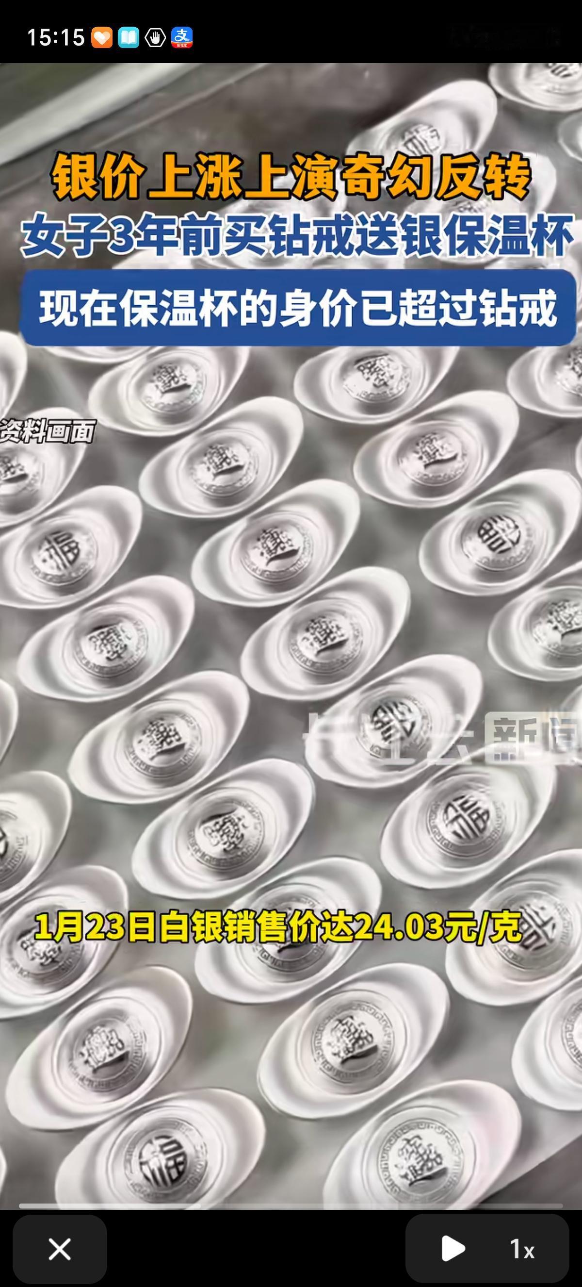 以前嫌弃金价太贵舍不得买,万万没想到以后银子也要买不上了。王女士3年前买钻戒赠送的保温杯现在值2000了,而花6000元买的一枚钻戒,现在去回收时只值700元。 这两天白银的价格涨的太快了,涨到24.03/克了,累计涨幅超过了37%,有网友说开银饰品的店家都跑路了,不跑不行了,太多人找店家提前订购了不少白银元宝和银条啥的。 店家也没想到白银涨价那么快,就拖拖拉拉的,自己还没进货呢。卖家没办法应对好几十号买家,直接连夜跑路了。