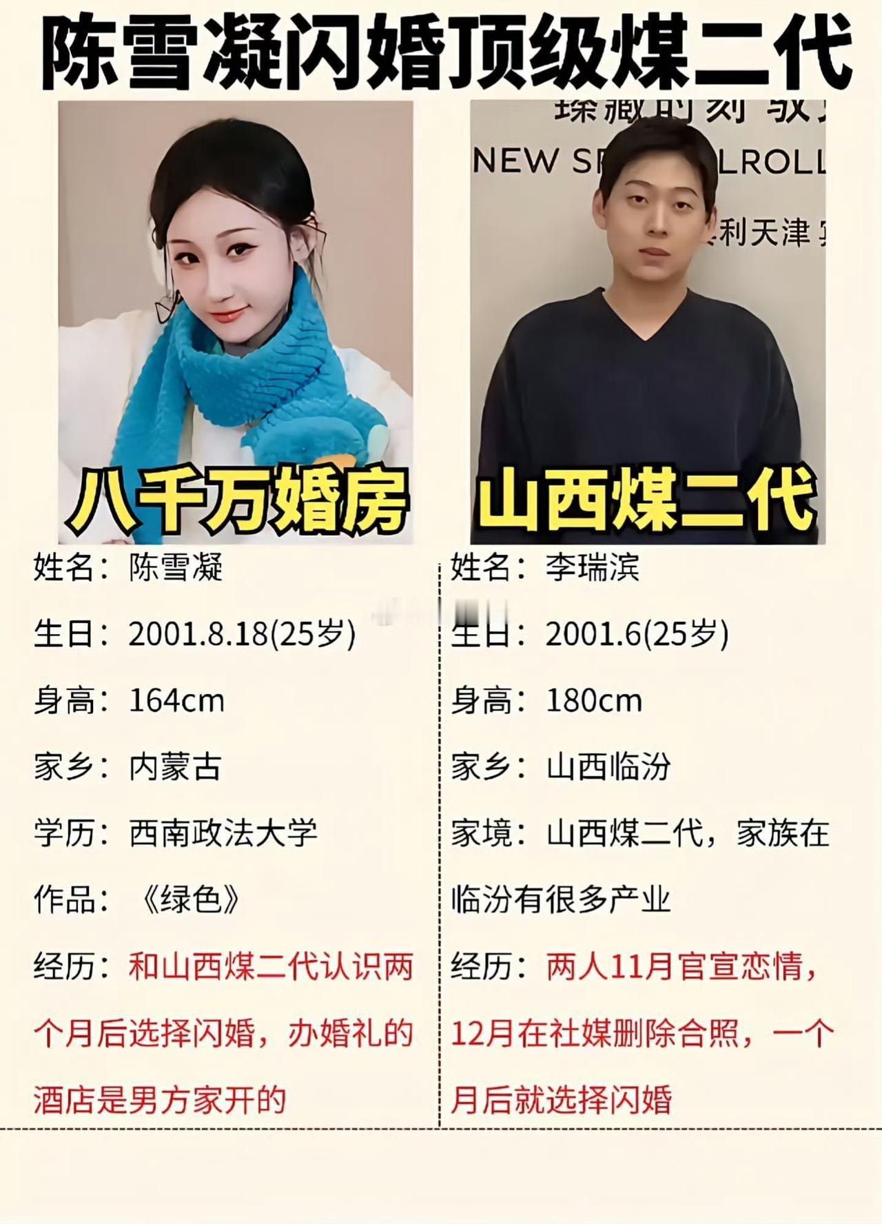 网红歌手陈雪凝煤二代老公新婚前一天出轨,这瓜也够绿的。陈雪凝和老公李瑞滨2025年8月20多号结识,李瑞滨是山西某煤老板的公子,家里资产丰厚。陈雪凝和李公子认识不到两月,11月就对外宣布在一起,12月就光速领取了结婚证,看起来是彼此的真爱,1月火速结婚。看起来恩爱的夫妻,却爆出李瑞滨在新婚前一天出轨她人,果然有钱人忠贞的爱情就是骗人的鬼话,哪怕对方是再漂亮,再有社会地位。陈雪凝 余温陈雪凝 薛凝月