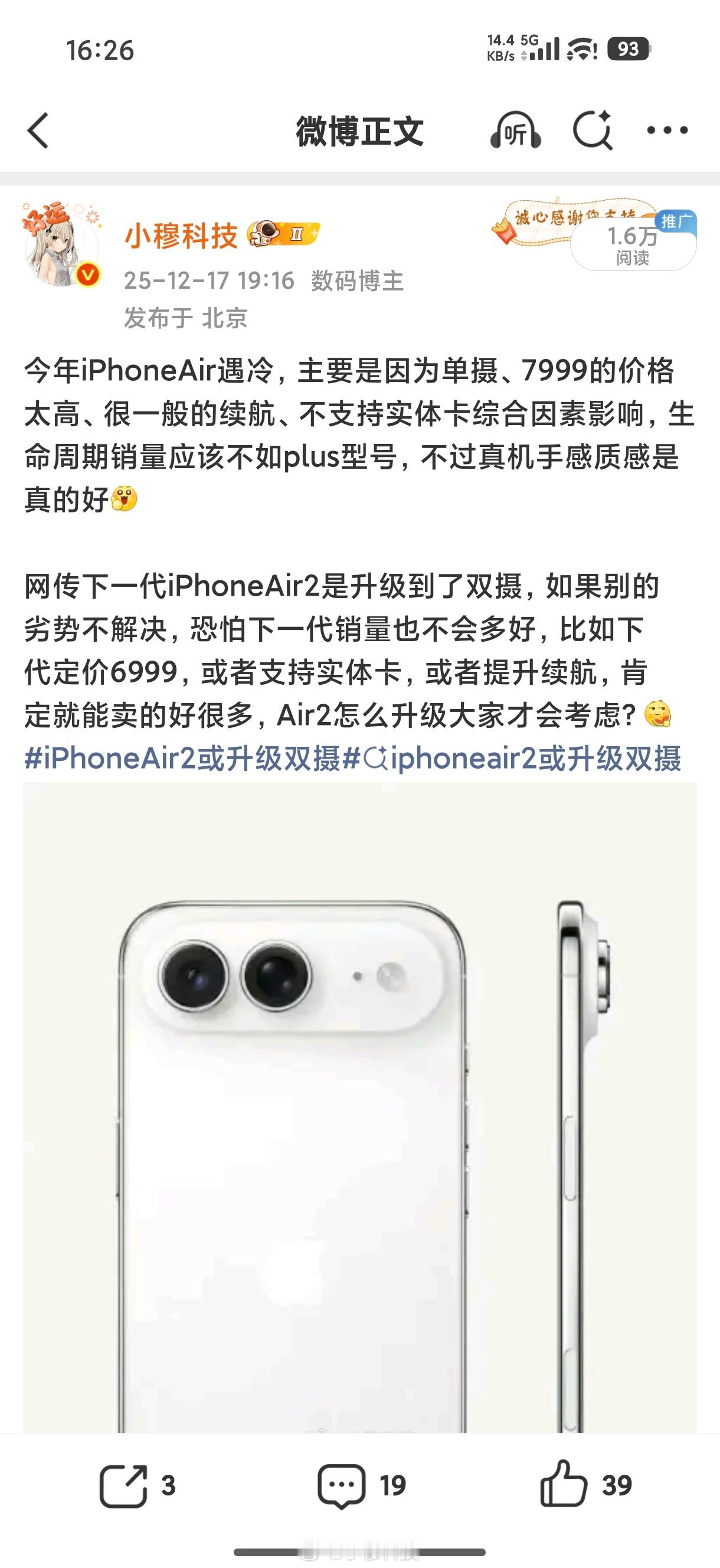 iPhone Air官方价格暴跌2000元iPhoneAir这款创新机非常特殊,大多都是数码博主们在用,属于让人又爱又恨爱在博主们玩遍了各种机,只有iPhoneAir能给他们带来前所未有的新鲜感和体验,如同倾国倾城的绝美少女恨在光有华丽的外在,没有扎实的用料,只适合玩玩当备胎,很难作为核心主力对于大众用户来说,这样的配置和价格是无法接受的,而官方也意识到这一点,面对库存积压问题,直接爆降2000促销,网友直呼那还有什么缺点,最大的缺点就是钱包不够iphone air官方价格暴跌2000元