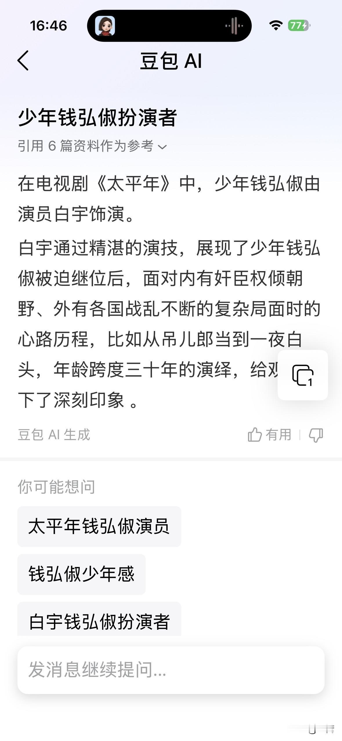 看了太平年前四集,除了人物太多脸盲症严重外,吴越国权力交接这一段剧情还是很紧凑的!虽然很多人吐槽看的稀里糊涂,但一边看搜索一边看演员表演还是比较过瘾的! 连AI都搞不清主角之一的钱弘俶的主演是谁,非要说白宇饰演的是青年/成年钱弘俶! 前四集钱弘俶的少年感那么明显,贵气、灵气和英气都展现得非常出色,怎么可能是30多岁的白宇能演出来的呢?! 《太平年》前四集的少年钱弘俶由梁家桐饰演,少年孙太真则是陈芷琰。 少年钱弘俶(前四集):梁家桐;青年/成年钱弘俶(全剧主线):白宇(领衔主演)。 终于理顺了,AI也是稀里糊涂的一笔。