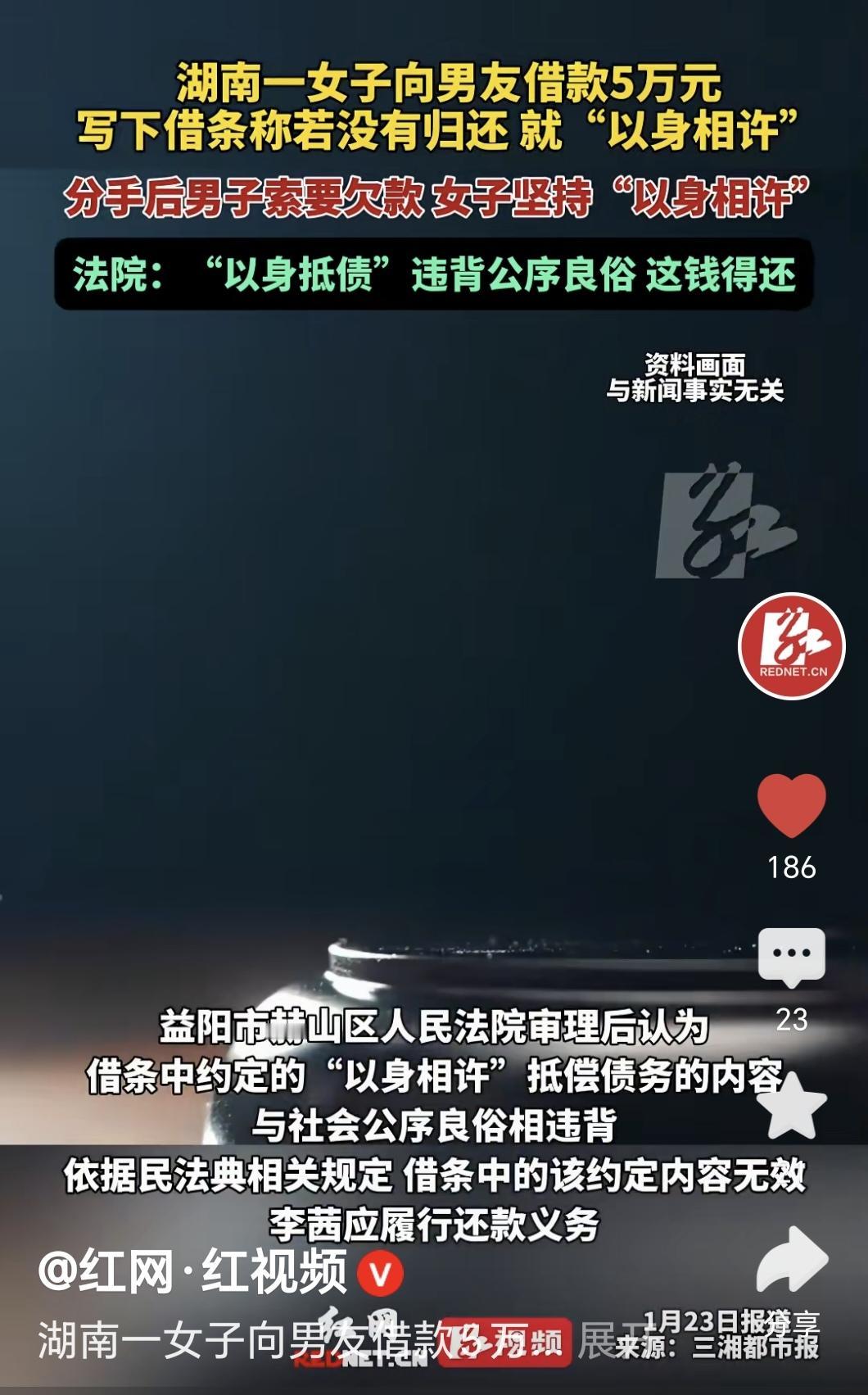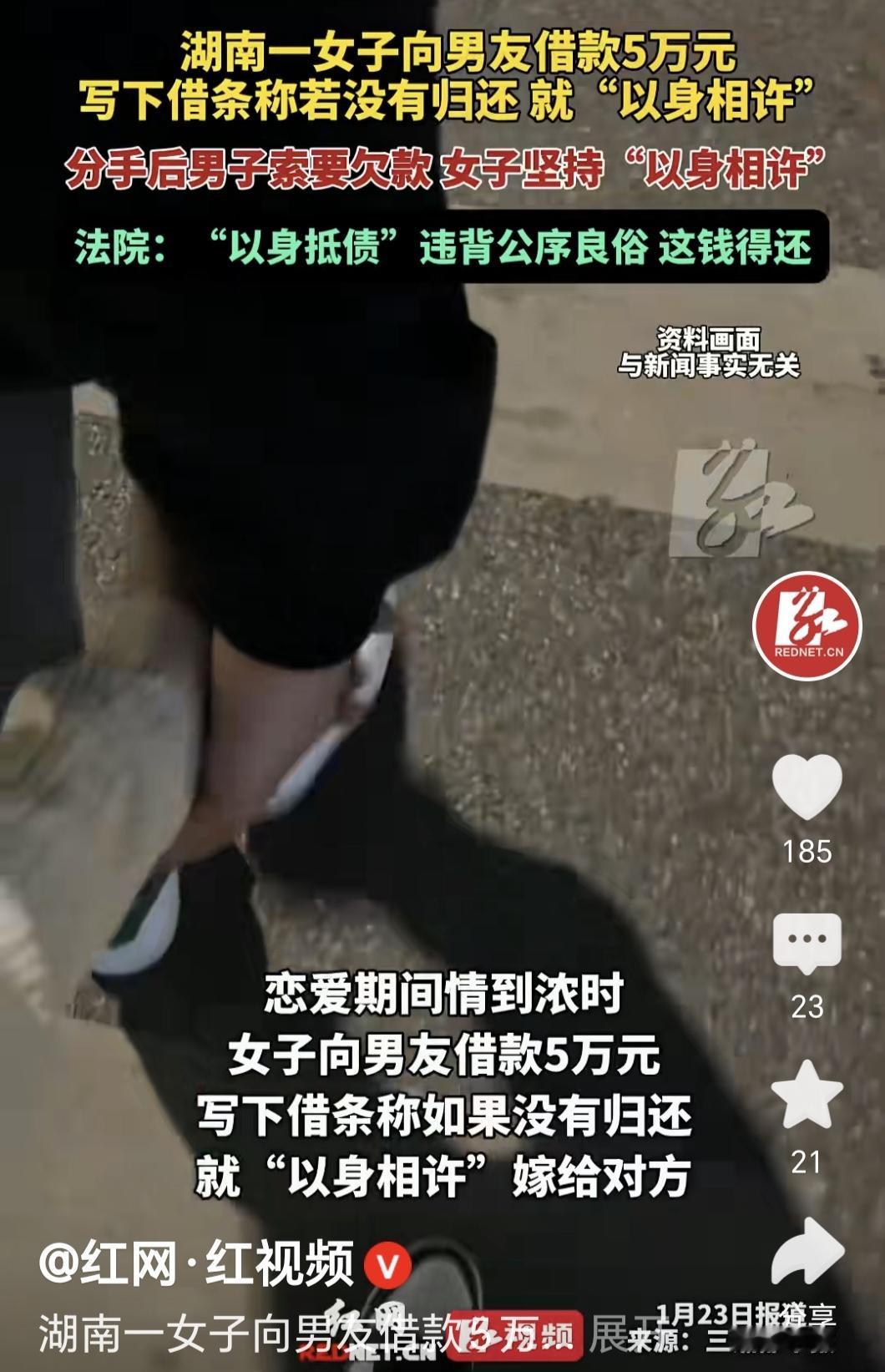 “欠5万还不上就以身相许!”湖南益阳这起奇葩案件,让无数网友惊掉下巴——情侣间的借款约定,竟把婚姻当成抵债筹码,可法院的判决,直接戳破了这场“浪漫陷阱”。 故事要从2025年的一场相亲说起,30岁的张强(化名)通过相亲平台认识了28岁的李娟(化名),两人一见如故,很快就确定了恋爱关系。热恋中的感情总是炽热又盲目,相处没几个月,李娟就跟张强开口,说自己生意周转遇到困难,想借5万元应急。张强正深陷爱意,想着情侣间互相帮衬是理所当然,没多犹豫就答应了。为了让他放心,李娟特意手写了一张借条,除了写清借款金额和转账事实,还加了个让张强当时觉得“很浪漫”的约定:“如果没有归还,本人自愿以身相许嫁给张强,此借款即视为张强赋予本人的彩礼,借条自借款到账后生效。” 张强没往深处想,只当是情侣间的小情趣,当场就通过银行转账给李娟转了5万元。 可感情就像易碎的玻璃,经不起时间的打磨。才过了短短几个月,两人就因为性格不合、生活习惯差异频繁争吵,曾经的甜蜜渐渐被矛盾取代,最后实在磨合不下去,只能无奈分手。分手后,张强想起当初借出去的5万元是自己辛苦攒下的血汗钱,便多次通过微信、电话跟李娟催要欠款。可让他万万没想到的是,李娟竟然直接拒绝还钱,还理直气壮地抛出了借条上的约定:“当初白纸黑字写得明明白白,我还不上钱就嫁给你,现在我愿意履行承诺,随时可以跟你去领证,这钱已经是彩礼了,凭什么还要还?” 张强被这番话气得火冒三丈,他坦言当初借钱纯粹是出于信任和对这段感情的珍惜,根本不是想靠金钱“买婚姻”。现在感情都没了,谁还愿意跟一个没感情基础的人捆绑一生?多次协商无果后,张强实在没办法,只能拿着借条、银行转账记录等证据,把李娟告上了益阳市赫山区人民法院,要求她偿还全部借款。 庭审现场,双方吵得不可开交。李娟坚持认为,借条是双方自愿签订的,自己没有违约,现在愿意遵守“以身相许”的承诺,借款早就转化成彩礼,按照习俗,彩礼哪有要回去的道理,所以自己不该再还钱。而张强则反驳说,婚姻的核心是感情和自愿,怎么能当成逃避债务的工具?当初他从来没想过以借款胁迫李娟结婚,现在两人感情已经破裂,借贷关系就该回归本质,李娟欠的钱必须还。 法院仔细审查了借条、银行转账记录等证据,还听取了双方的陈述,最终给出了明确判决。法官表示,婚姻关系是建立在男女双方完全自愿基础上的身份关系,具有人身专属性,不能作为金钱债务的履行方式或对价。李娟和张强在借条中约定“以身相许抵偿欠款”,本质上是把婚姻当成了交易筹码,践踏了婚姻自由和人格尊严,还违背了“禁止借婚姻索取财物”的法律规定和社会公序良俗。根据《中华人民共和国民法典》第一百五十三条规定:“违背公序良俗的民事法律行为无效。” 所以借条里“以身相许”的约定自始就没有法律效力。 不过法官也强调,这个附加条款无效,并不影响借条核心借贷事实的认定。张强提供的证据足以证明双方存在合法有效的借贷关系,李娟作为借款人,理应履行还款义务。最终,法院依法判决李娟向张强偿还5万元借款,双方都没有提起上诉,目前判决已经生效。 其实类似的奇葩案例并不少见,之前江西就有女子借款15万,约定逾期未还就做对方女友3年,最后法院也判定约定无效;江苏徐州还有一名女子为了抵债嫁给债主,结果婚后仅一个月就闹离婚,最终还是被判归还全部欠款。这些案例都说明,把人身关系和债务捆绑在一起的约定,根本站不住脚。 这里也给大家普及几个关键法律知识点:首先,婚姻、恋爱等人身关系受法律保护,不能用来抵消金钱债务,任何“以身抵债”“以恋爱抵债”的约定,都因违背公序良俗而无效;其次,借贷和彩礼性质完全不同,借款是债权债务关系,彩礼是附条件的赠与,不能靠一张约定就随意转化;最后,不管是情侣、朋友还是亲戚,发生大额金钱往来时,一定要明确款项性质是借是赠,最好写正规借条,注明金额、还款期限等,同时保留好转账记录、聊天记录等证据,避免日后扯皮。 这起案件真的让人啼笑皆非,李娟以为靠“以身相许”的约定就能赖掉5万元欠款,结果不仅没得逞,还落了个“耍无赖”的名声。其实感情诚可贵,但金钱往来一定要拎清边界,恋爱时可以浪漫,但涉及到钱,千万不能糊涂,更不能把婚姻当成交易的工具。 大家觉得,如果是你,会同意恋人写这样的“以身相许”借条吗?遇到这种赖账的情况,你还有什么更好的解决办法?欢迎在评论区聊聊你的看法! 来源:光明网、极目新闻、环球网(本文人物均为化名)