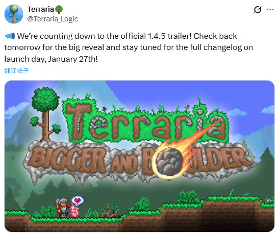 《泰拉瑞亚》1.4.5版本更新宣传片将于1月25日公开,1月27日正式上线。