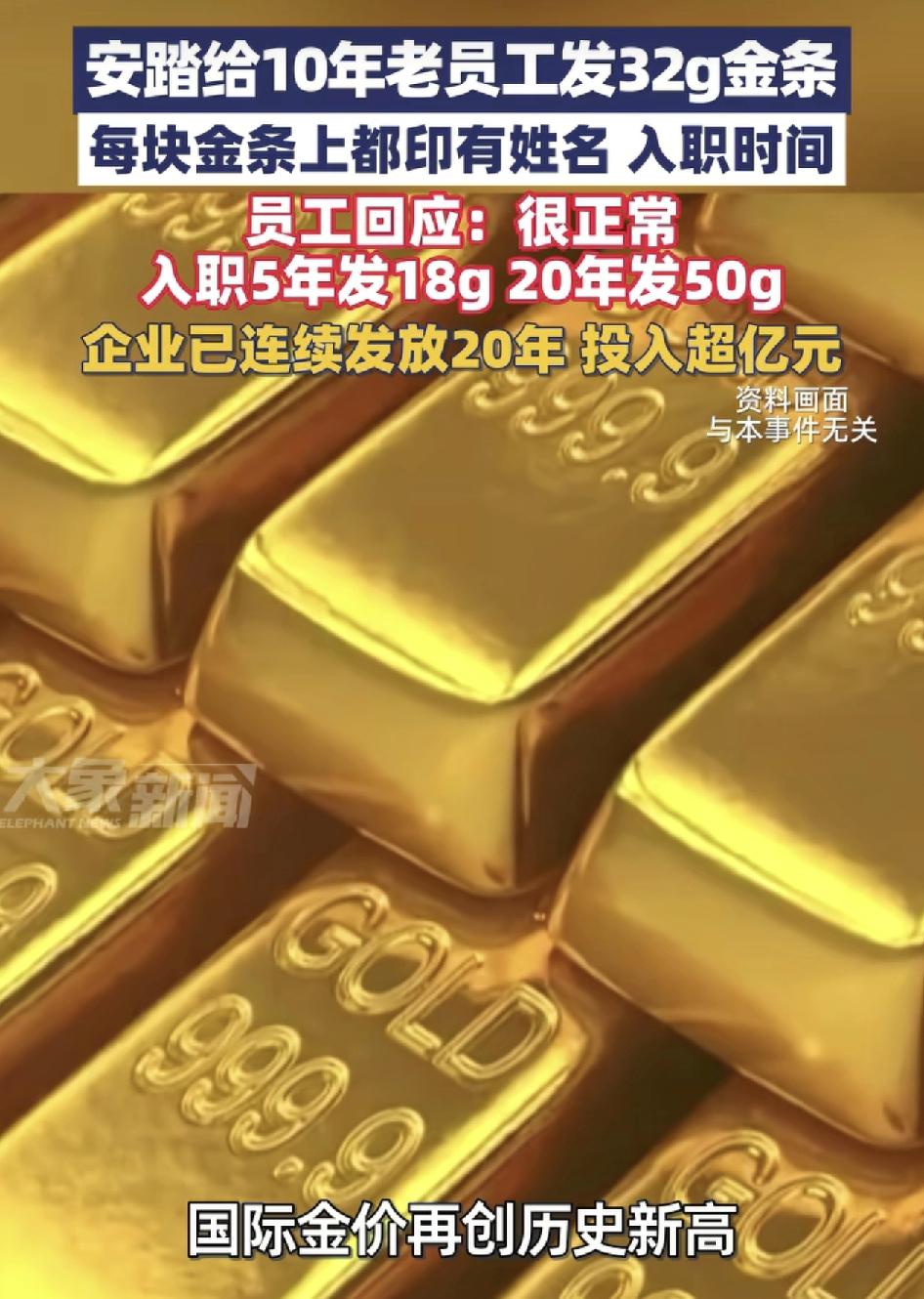 近日,安踏的老员工分享视频称,自己收到了公司发放32克的金条。很多老员工都表示,这已经不是什么新鲜事了,因为入职5年的老员工就会得到公司发放的18克金条,入职10年就会获得50克的金条,这已经是公司连续20年的惯例了。发放金条的金额超亿元,随着金价不断升高,老员工获得这样的年终奖品,真的是乐开了花。