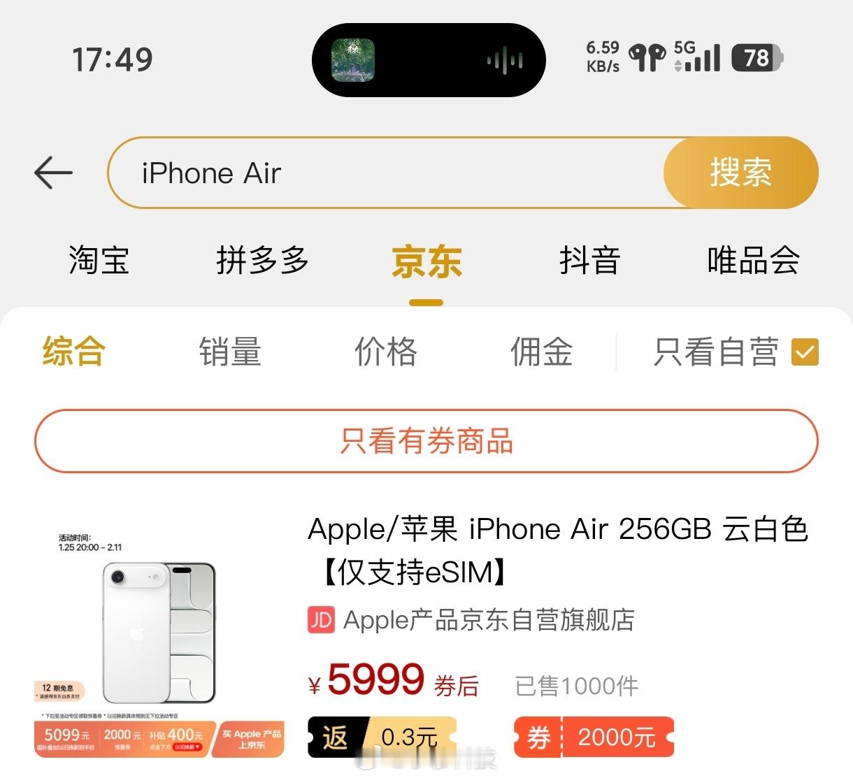 iPhoneAir在狗东销量只有1000+,统计口径应该是月度,看来真的没啥人买