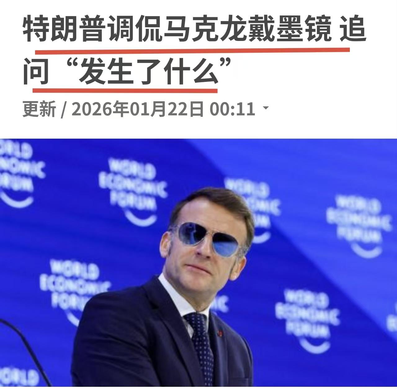 马克龙在瑞士达沃斯出席第56届世界经济论坛(WEF)年会时佩戴墨镜,酷似007, 这让79岁的特朗普羡慕嫉妒恨,于是想即兴调侃一下小马哥,“好漂亮的墨镜,比总统本人还酷。”言下之意,你这个法国总统干得不咋样。 马克龙反唇相讥道,“我们法国人强调自主性和独立性。” 把特朗普怼的哑口无言,瞠目结舌。