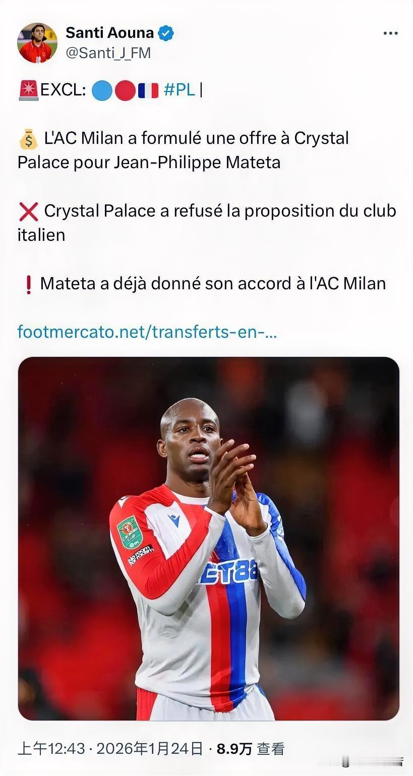 达成一致!米兰与马特塔个人条款达成一致,这太突然了,之前不是说转会尤文图斯只差最后一步了,这是啥情况?米兰这是准备帮忙抬价?我们现在买马特塔?难道说新的债主来了,要送礼物?金主来了送礼物能理解,债主也会送礼物? 米兰管理层于本周五就马特塔提出了报价,但这份报价遭到了水晶宫的拒绝。而马特塔本人已经与这家意大利俱乐部(米兰)达成了协议。据说米兰会考虑再次送出报价,这个事情挺诡异的,难道说米兰冬季窗口真的有大动作?问题是之前水晶宫俱乐部和尤文图斯的谈判不是差不多了吗?这是谈崩了?还是米兰被水晶宫拉过来抬价,有点懵啊。 虽然水晶宫拒绝了米兰对菲利普·马泰塔的报价 但红黑军团并未放弃希望,仍然决心继续自己的选择。斯基拉消息称米兰与马特塔经纪人从未切断过联系,马特塔一直是米兰的目标球员,莫雷托虽然没有关于马特塔的消息,但莫雷托消息称卡迪纳莱会议很可能有关于米兰转会的一些建议,卡迪纳莱希望米兰成绩可以继续提升,通过转会来强化阵容是最有效的提升手段。