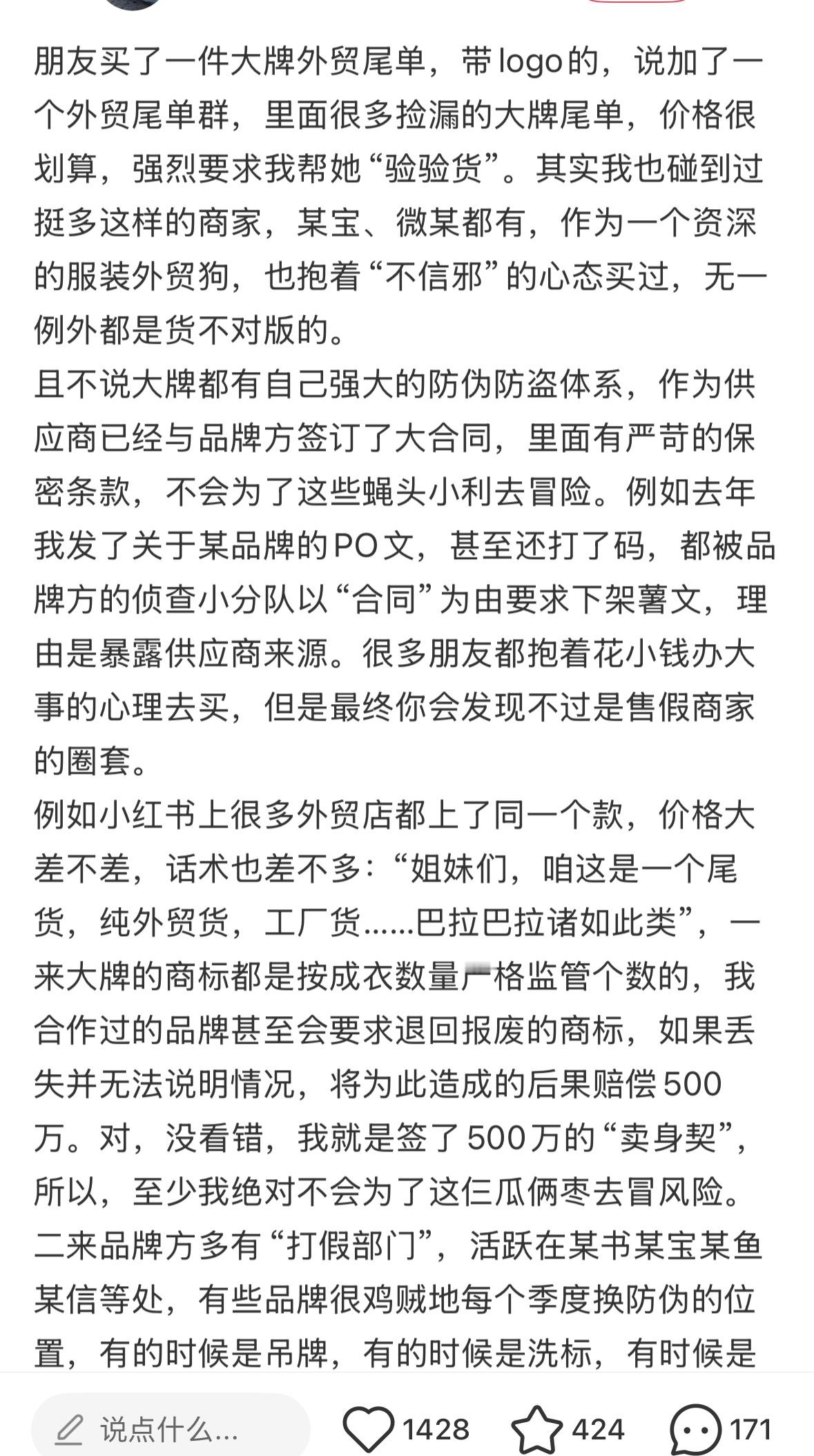 沈梦辰科普奢侈品尾单货都是假的 超过10件的尾货大概率都是假货。沈梦辰的科普很实用了,说的没毛病。奢侈品代工厂的品控和协议不是摆设,流出尾单根本是自砸饭碗,官方渠道扫货到最后一颗纽扣都不稀奇。所谓原厂原单,99%是假冒产业链玩的话术,拿来割韭菜的。有人信这个,本质是虚荣心在经济学上的投射。以为“捡漏”是高情商体现,其实是被精准投放的消费陷阱。奢侈品行业吃的就是品牌溢价,高仿装尾单,骗局套娃罢了。建议直接拉黑这类卖家,省下钱干什么不好。奢侈品逻辑里,没有漏,只有税。分析:沈梦辰科普奢侈品尾单货都是假的涨知识了!看沈梦辰的科普才恍然大悟,网上那些号称奢侈品尾单、代工厂
