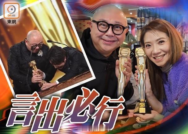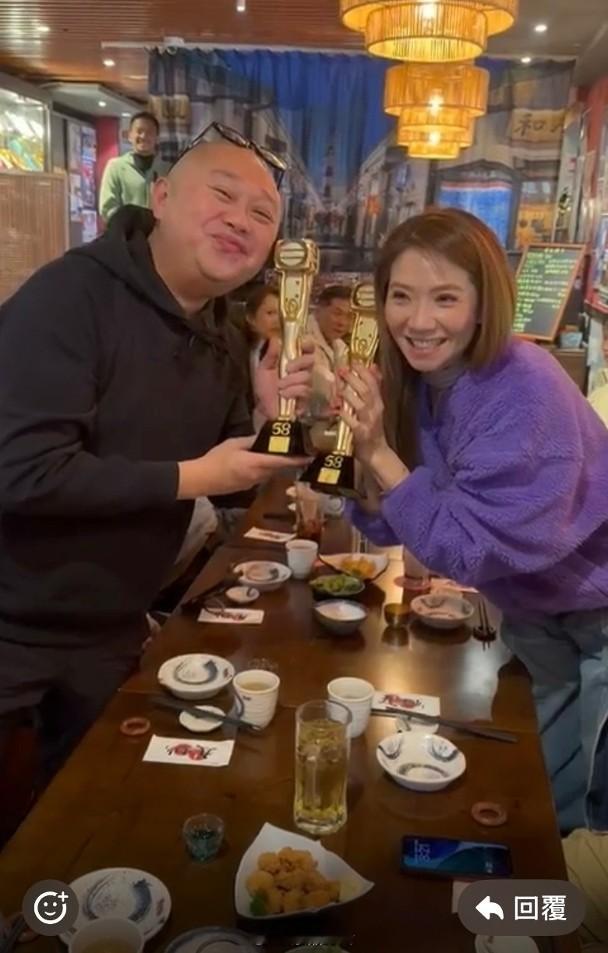 【On.cc】Bob見獎座「完整無缺」展歡顏 孖車婉婉「找數」搞慰勞宴林盛斌(Bob)與車婉婉在《萬千星輝頒獎典禮2025》中分別獲得最佳男主持及女主持獎,昨日(23日)兩人在日本餐廳包下廂房,慰勞《中年好聲音》、《女神配對計劃》及《攻你上大學》全體幕後,相當有心。據知二人於等候頒獎禮結果期間,因互相睇好對方,故約定若齊齊攞獎一定要夾份宴請3部綜藝節目的所有幕後予以慰勞,昨晚二人言出必行「找數」!林盛斌和車婉婉實至名歸。Bob於頒獎禮當日榮獲最佳男主持時,因過度興奮「Bob爆獎」引來全城熱話!昨晚兩位主持收到大會補發刻有二人名字、得獎項目及「58」等字樣的真獎座,當Bob看到完整無損的獎座時,不但笑得像個小孩,而且滿面期待。Bob接過獎項後,即愛不釋手地摸勻獎座上下,又拿著獎座與婉婉開心「碰盃」,期間還不忘自嘲:「要細細力吖!」,之後又問大會工作人員:「之前啲碎片呢?」 相當搞笑。車婉婉眾望所歸。林盛斌開心晒。林盛斌和陳婉婉慰勞工作人員。林盛斌笑逐顏開。林盛斌頒獎典禮上整爛獎。當晚場面爆笑。