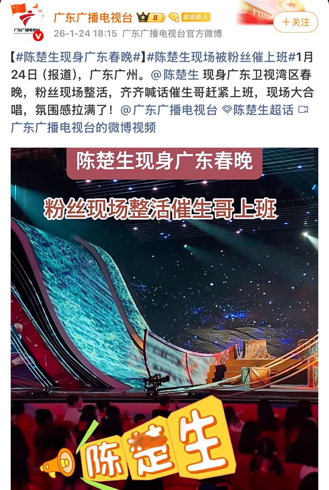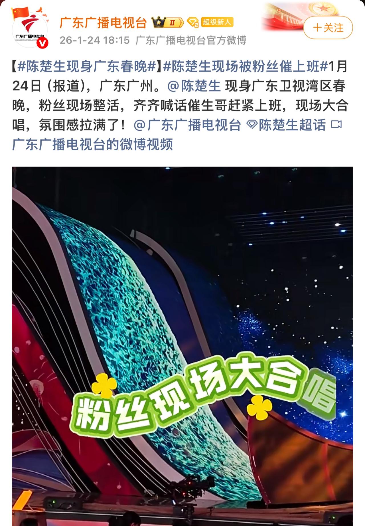 陈楚生现身广东春晚,现场粉丝催上班。 哈哈,广东卫视很会带节奏,提早发出了陈楚生参加广东卫视湾区春晚的录制花絮,一小段视频里听见粉丝们高喊“陈楚生,上班啦”,然后开启了现场大合唱,直接拉满了整个现场气氛! 据说这次陈楚生演唱的是粤语歌曲《港湾》,好听又应景,那就期待起来啦🥰!