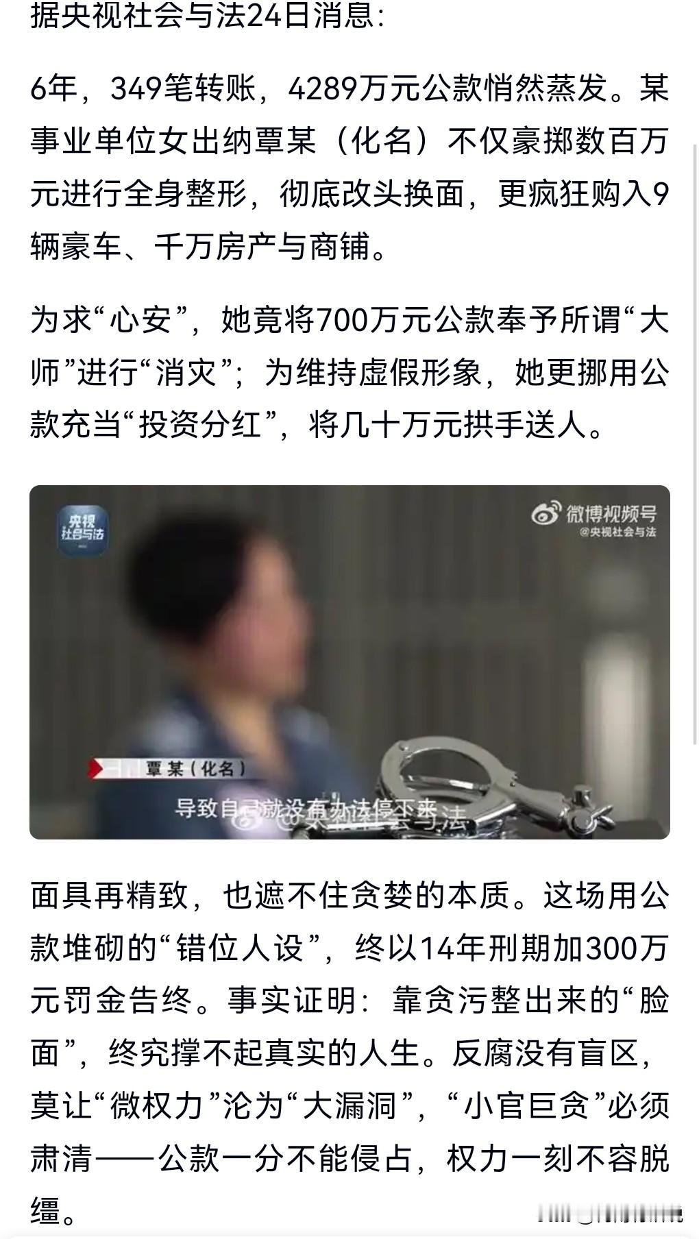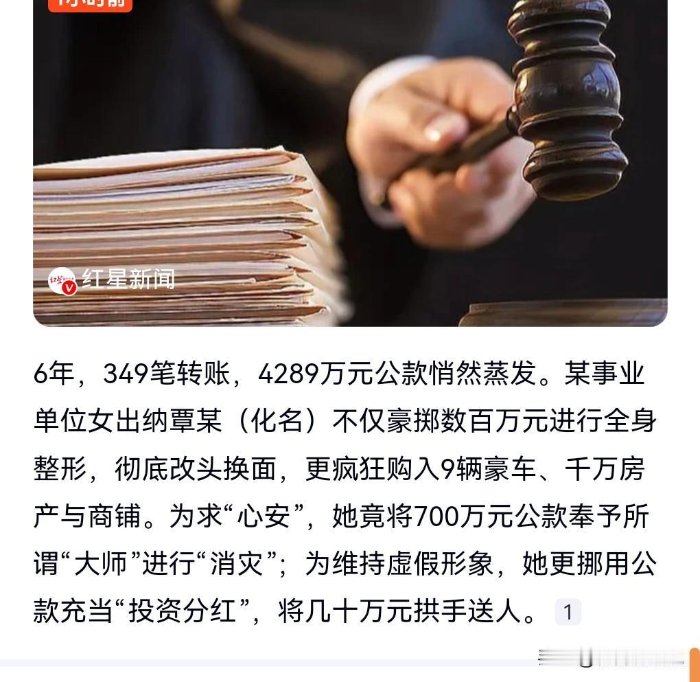 这真的是无法无天,完全不计后果啊。 不过漏洞也是大,没想到几年之后才发现出纳贪了这么多钱。 央视社会与法24日报道。 事业单位出纳6年贪4289万元公款,她花几百万进行全身整形,买了9辆豪车,买了千万的房产和商铺。 为求心安,给了骗子大师700万进行消灾。 真是愚不可及呀。 最终被判有期徒刑14年。