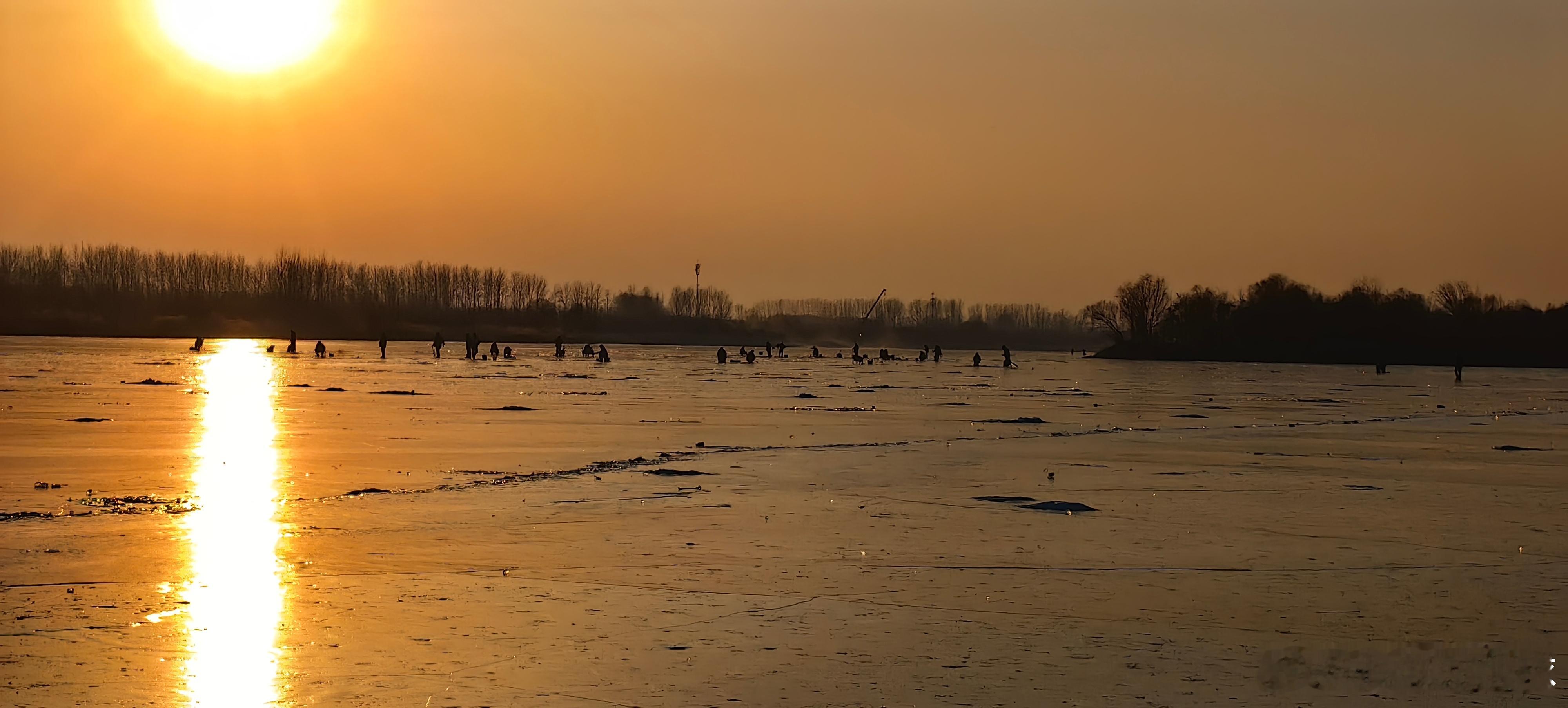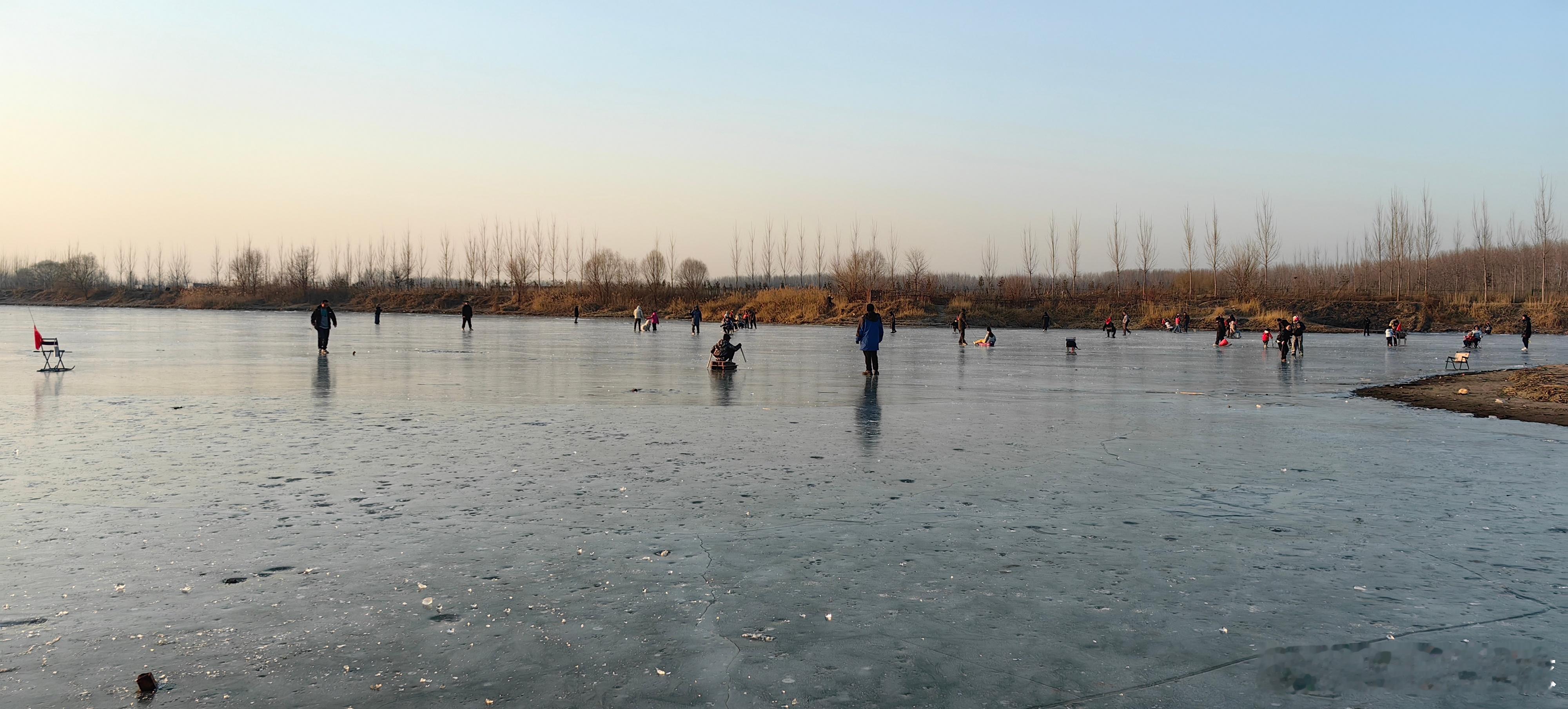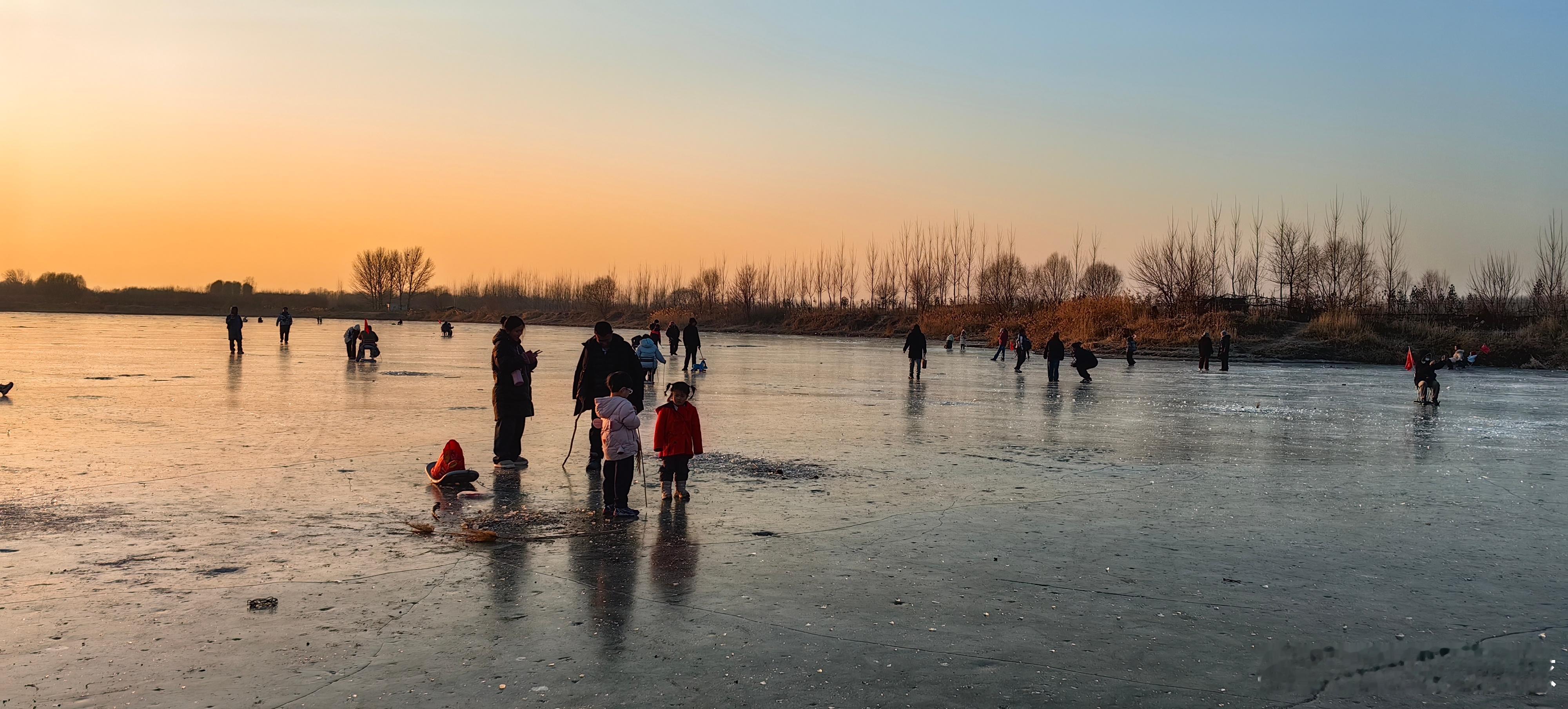 冰很厚,日很薄,人很多,冬天刚好滑冰落日