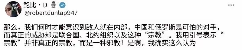 特朗普,这家伙真是,天不怕地不怕,什么都敢说,什么都敢做。在自己社交账号中,转发了一个网友的帖子。帖子内容说了,中国和 俄罗斯是可怕的对手。而真正的威胁,是联合国和整个北约。并声称联合国和北约,不是宗教,而是邪教。 老特,这家伙,这种人很难缠,你永远不知道,他脑袋在想什么。