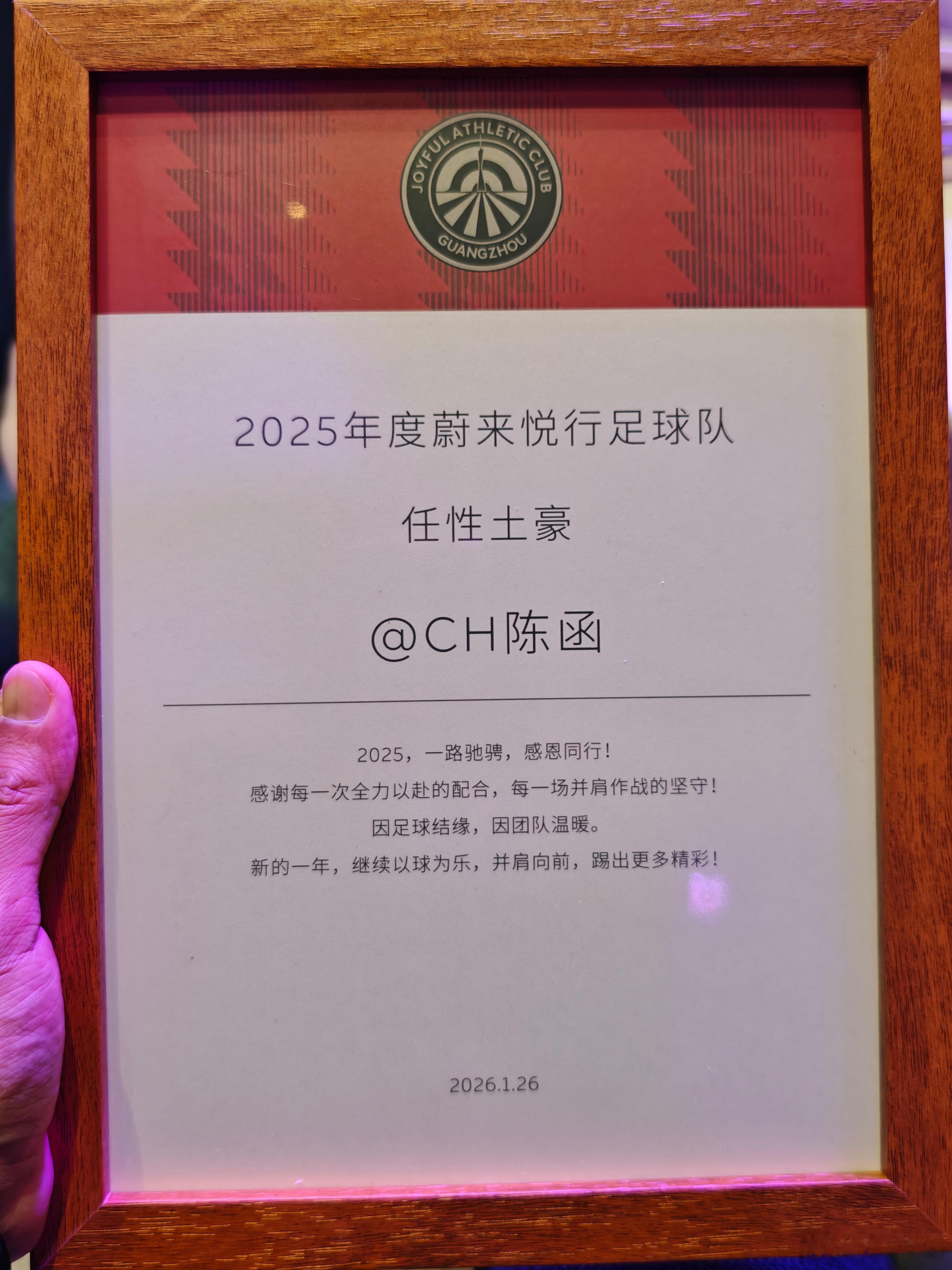 今天是个好日子!不仅是国足U23亚洲杯决赛,而且还是蔚来广州车友会足球队7周年庆典。一不小心拿了个奖,因为会费期期交,但是却没有什么时间去踢球波哥特意赶回来参加,图5踢球的样子真帅,又是一个被事业耽误的球员。