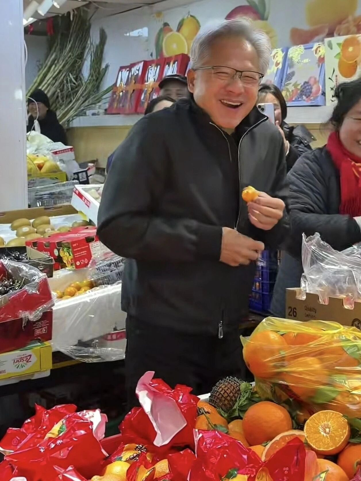 在台北吃大排档路边摊,在韩国吃汉堡喝啤酒,来上海逛菜市场水果摊,黄仁勋的接地气亲和力 IP 策略已经搞成一张名片了。
