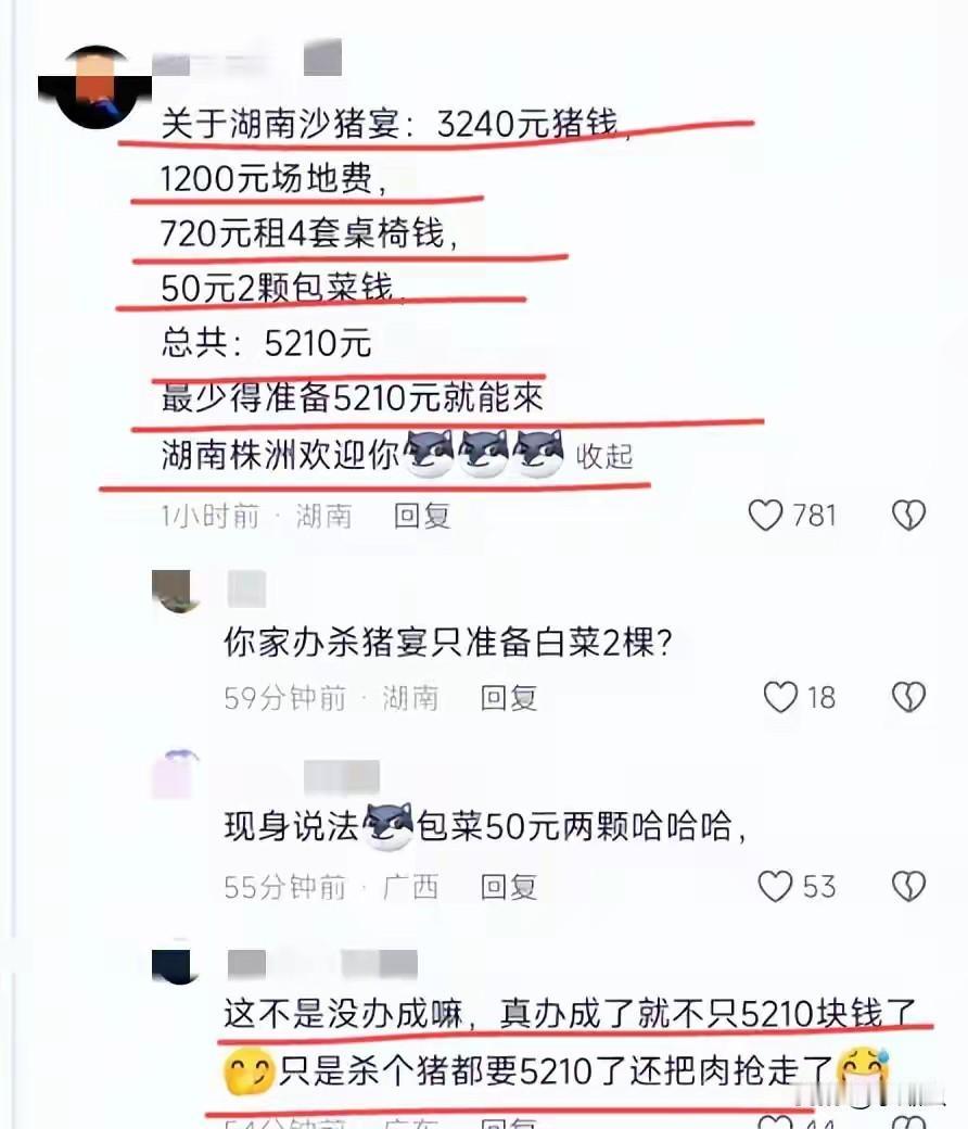 杀猪宴翻车最伤心莫过这个精神小伙。 要走了,还被鞠躬要求道歉,说对不起。 这群小伙子,哪怕身上有2000元,早就甩出来了,但可能真的没有,100块都可能没有,最后叫大主播来支付,从2000元砍到1200元。 这场杀猪宴,没办成功都花了5210元。 前后利益都是村民得利,但要场地费,没一个村民帮忙住持,还放话不服单挑,这精神小伙子被搞到无地自容,希望这位小伙子对未来不要太多困扰,毕竟不是每个村都是这样的子。 有人说,这个村里人对付场费是应该的。 但大部分网友,千言不万语不应该拿出开山刀出来。 刀一拿出来,这个村民有理也变无理。