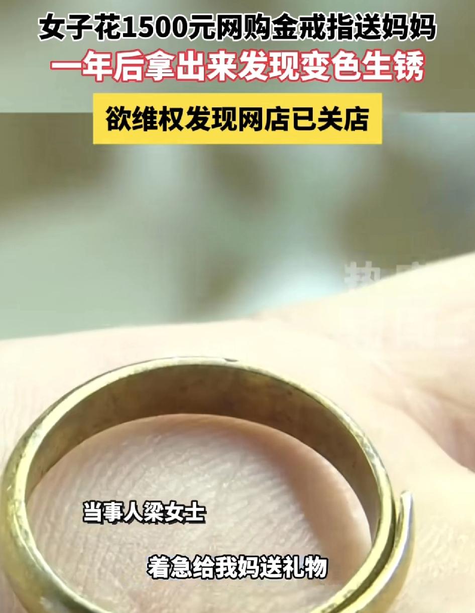 浙江一女子一年前花费了1500元网购一枚金戒指作为礼物送给妈妈,花费了1500元,不过妈妈平时很少戴这枚戒指一年之后,再让他妈妈拿出来看一下。结果发现戒指居然生锈了,现在再次想联系那家店铺,发现已经关闭了。我有说网购金银首饰确实存在很大的隐患。很少消费者专门把黄金送去专业的机构去检测,往往是被商家的低价格而吸引。