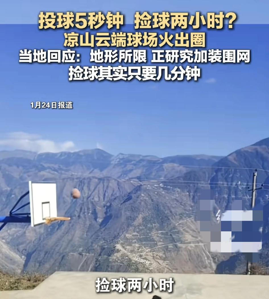 凉山云端篮球场一段小伙子打篮球的视频突然火出圈,一名男生投篮一下子篮球就滚下悬崖,无奈男生转身离开,这个球场看似建在了悬崖边上,实际上下面还有花椒树和农田。不少网友纷纷出招,应该在篮球场边上建围网,当地的村民也是很爱运动的。当地的工作人员介绍,该球场建于2020年,因为地势的原因,只能建在悬崖边上。捡球几个小时有点夸张,实际上几分钟就可以。