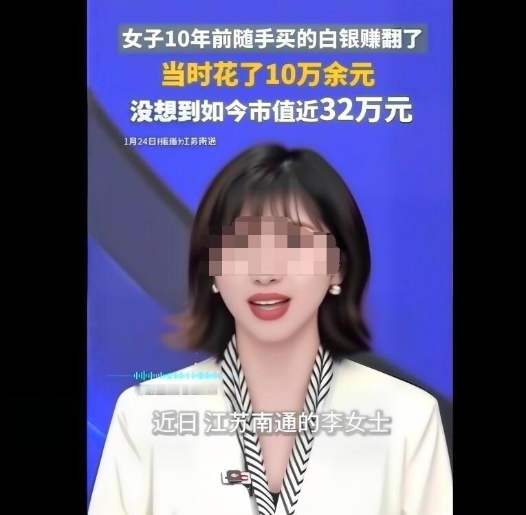 10年前,花10万多买白银,10年后,已升值为32万,赚了吗? 江苏南通,李女士突然发现自己发了一笔“小财”。 原因是,10年前,她在银行花10多万买的贵金属白银,现在已经涨到了32万元。 有网友羡慕她这波“躺赚”, 也有网友吐槽她是赔了,投资黄金回报更高。 不过,个人觉得,能把10万块钱投资轻轻松松忘了的人,也不差这10万块钱。 所以,对于李女士来说,32万恐怕就是账户上的一个数字吧。 而对于我们普通人来说,也就看个乐呵。 毕竟,普通人可没有那么“大方”,能轻易忘记自己有10万块钱的投资。 你们说是不是?