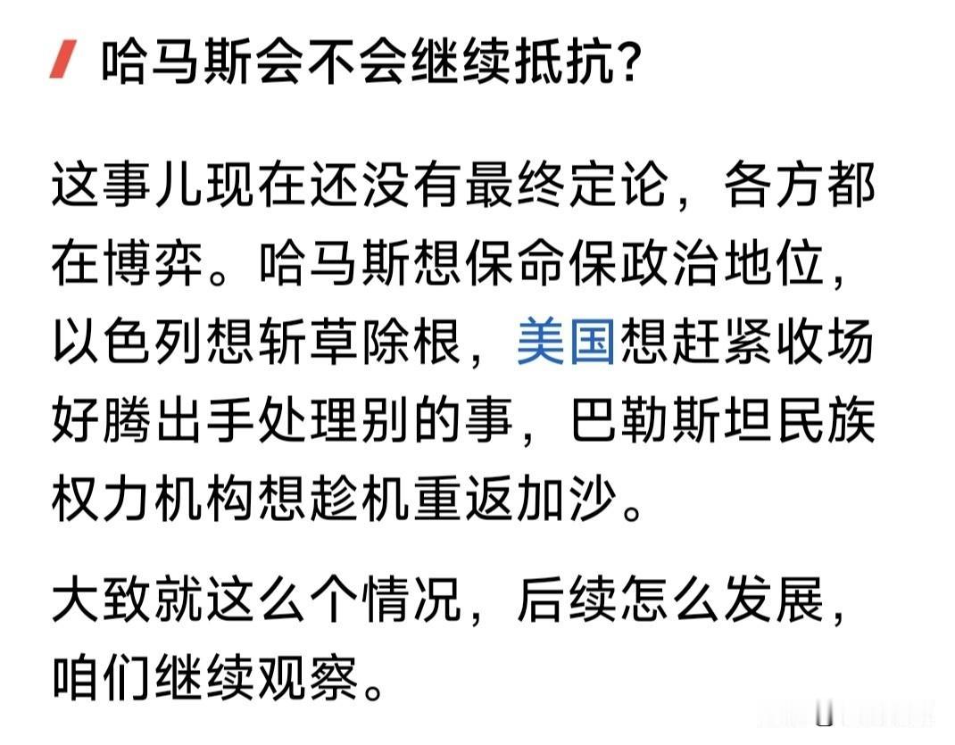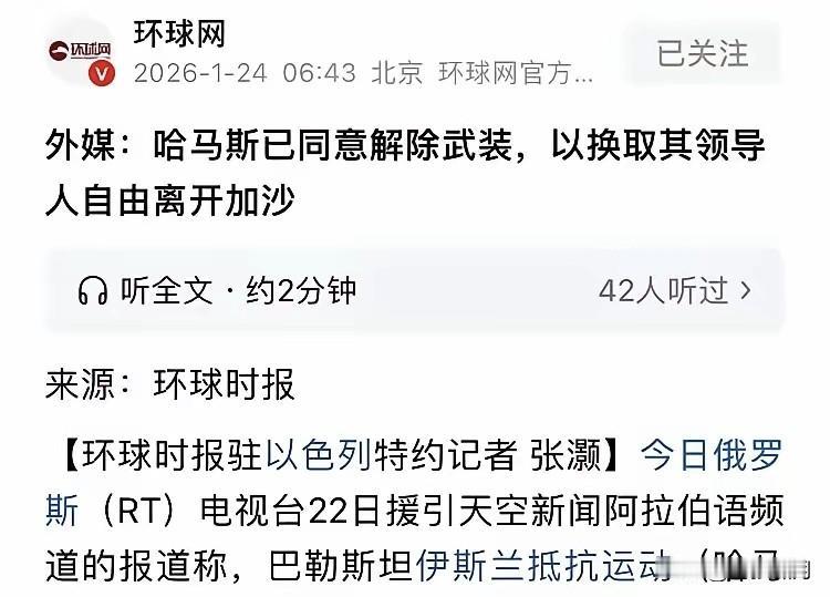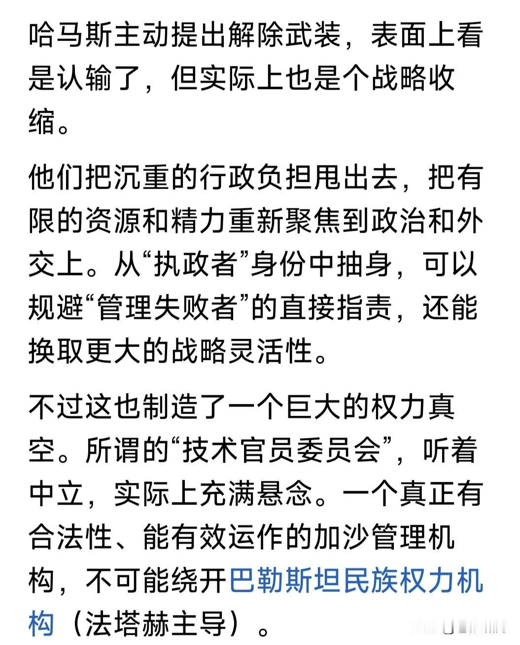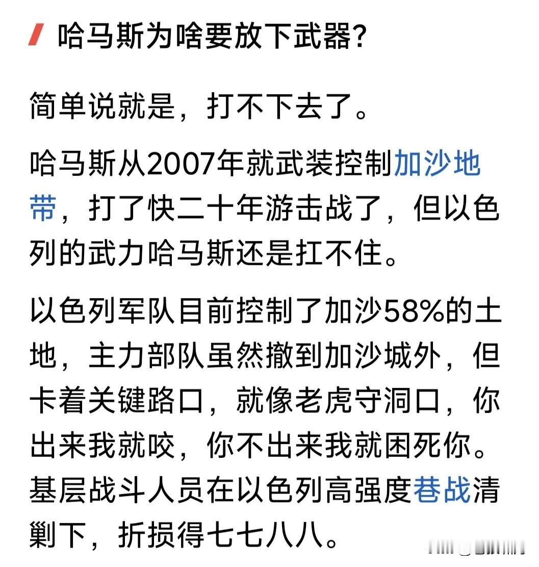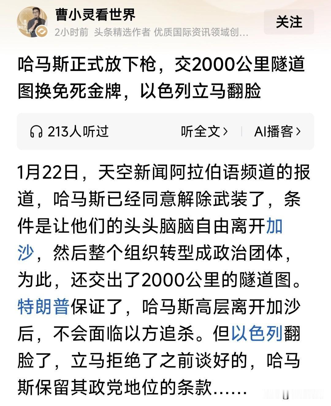 哈马斯深陷绝境,终于同意解除武装!变成纯粹政治团体,并将加沙地道全图交给美以,换取领导人安全离开加沙,要求美以保证不再追杀! 哈马斯坚持至今,为何同意解除武装?只因以军封锁边境,切断海空通道,四面铁桶般围困,武器来源中断,粮食补给困难,还能再耗下去? 当下以哈“20条”停战协议,已进入第二阶段,核心就是哈马斯解除武装!若哈马斯不同意,以军将重新攻击。与其干耗等死,不如争取活命? 为了表示诚意,哈马斯高层把加沙地道全图都交了出来!哈马斯武装分子还往哪里逃?如此看来为了保命,底层士兵在高层眼里,算什么呢? 目前美方已同意哈方要求,允许哈马斯解除武装后,其领导人可以安全离开,部分成员可参与加沙政府与警察工作。关键问题是以色列愿意吗? 美方为何同意哈马斯要求?是否因此事拖得太久,影响更重要的事情,比如美伊问题,俄乌战争,都要投入更大的精力!还是及早了断此事吧! 此事最大的变数在以色列!尼亚胡会容忍哈马斯高层逃走吗?会让哈马斯成员参与加沙政府和警察工作吗? 之前有人质与地道难题牵扯,让以军无法痛下狠手!如今这些障碍都没了,终于有机会将哈恐一网打尽了!以色列会放过这个千载难逢的机会吗? …………