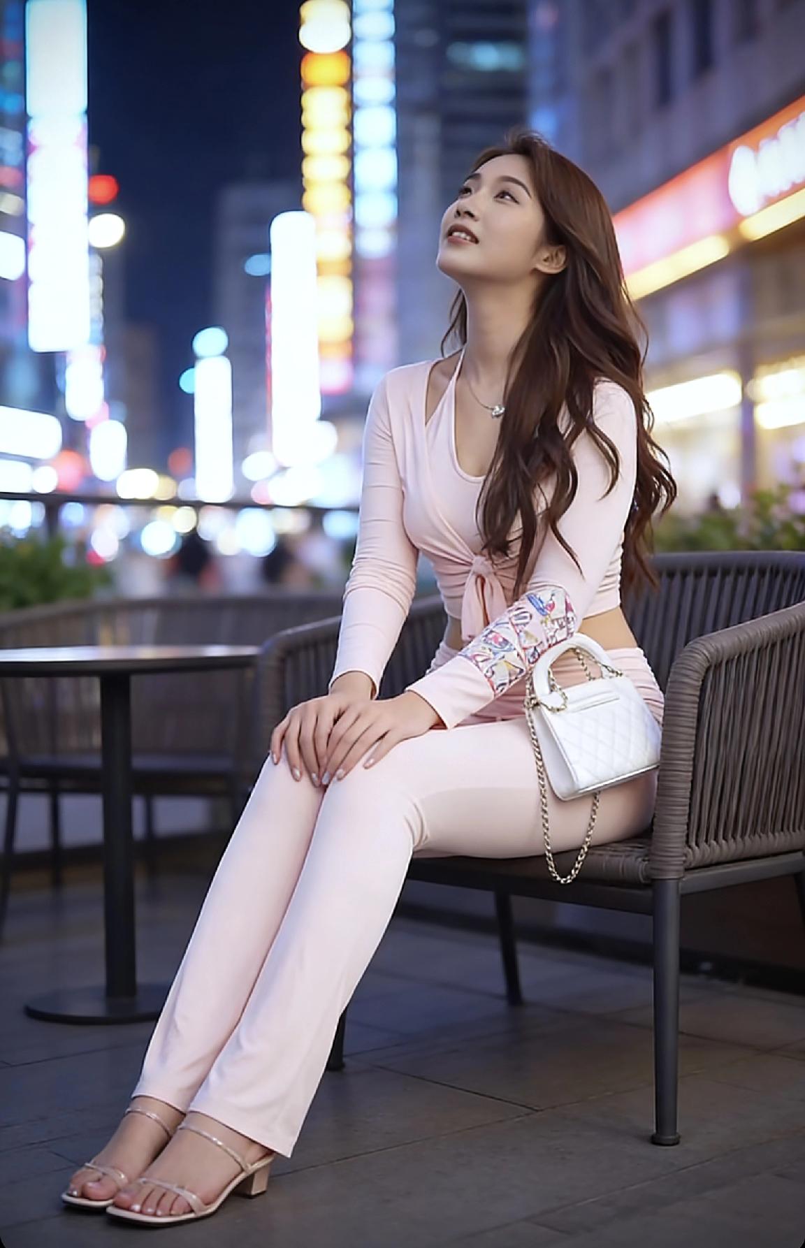 都市夜色下的时尚穿搭,粉色套装搭配白色手袋,尽显优雅与自信。