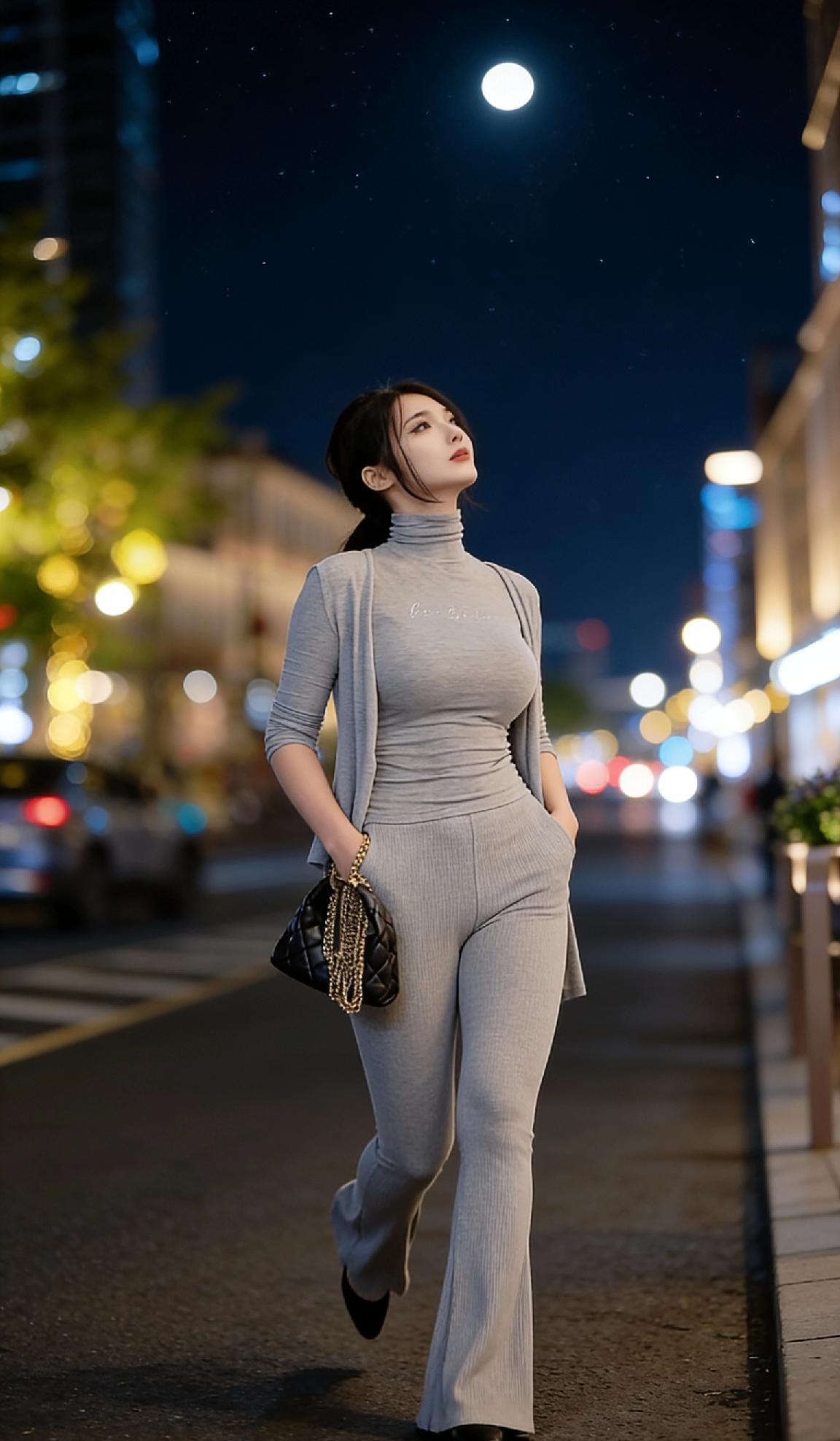 夜晚街头的优雅少女,浅灰色套装搭配黑色链条包,尽显时尚与魅力。性感紧身裤穿搭 紧身裤身材