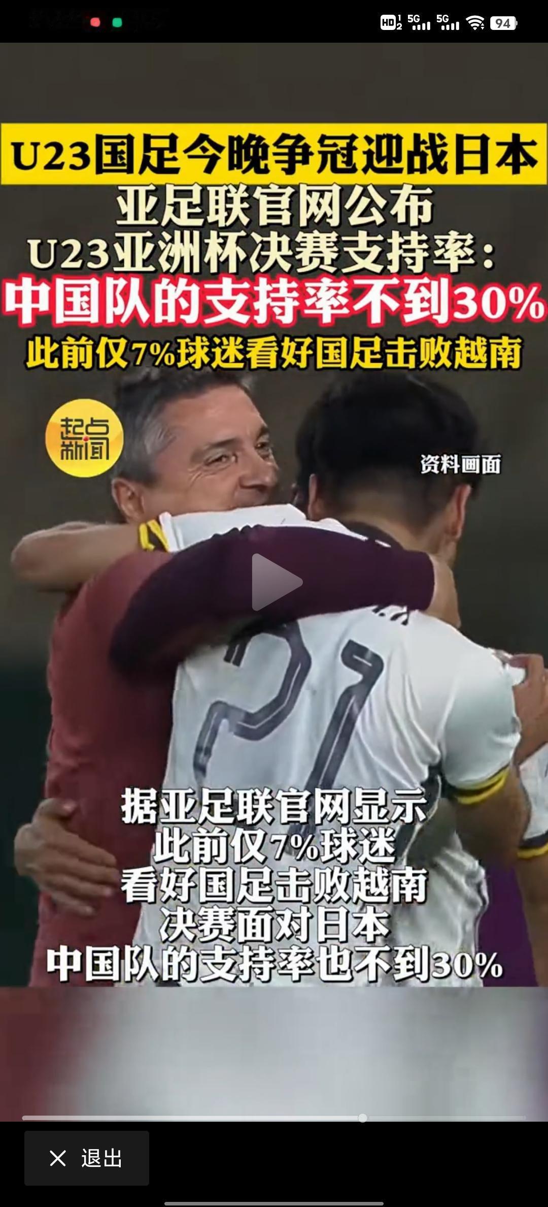 亚足联官网显示,U23国足在1月24日23点的亚洲杯决赛中夺冠支持率不到30%,远低于日本队的70%。这数据一出来,社交网络就炸锅了,中国男足又被推上风口浪尖。 不过,咱U23国足一路走来已经创造历史。从小组赛到半决赛5战0丢球,门将李昊狂扑28次,后防线更是固若金汤。虽然日本队是上届冠军,技术流也是亚洲榜样,但咱中国队没包袱。就像主教练说的,他们配得上决赛。“干就完了”,这场决赛,胜负还真不好说! u23世界杯 u23队 U23足球比赛 u21亚洲杯 U23足球队 中国u22男足 U23国足出线