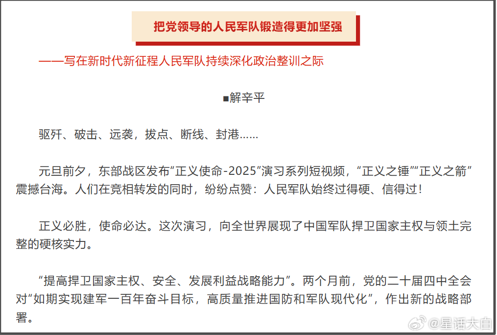 1月12日解放军报发表的一篇评论文章,已经做了很明确的预期管理。这是一篇署名评论文章。我从文章结构来分析。该文章的副标题是《写在新时代新征程人民军队持续深化政治整训之际》也就是该文的主题是说通过“持续深化政治整训”,来“锻造得更加坚强”。前言是以元旦前夕,东部战区的“正义使命2025”演习为开始。这次演习是一次围岛演训,之前也跟大家分析过。这个开头结合文章里的一些内容,本身就蕴含着一些信息量。说完东部战区的围岛演训后,该文章在前言顺着提到了“二十届四中全会”。紧接着就是提到在这次会议公报末尾提到的事情,也就是一些人事处分。就顺着引出“反腐”这个关键主题。“不以铁腕反腐将后患无穷。‘沉舟侧畔千帆过,病树前头万木春’。前言最后一句话则做了一个总结:“铁甲列阵、巨舰巡弋、战鹰凌空、雷霆越海……人民军队备战慑战、亮剑台海,印证一个有力判断:反腐越彻底,攻坚越托底,强军越有底。”这里有一个很关键信息。就是将“备战慑战、亮剑台海”,与“反腐越彻底,攻坚越托底,强军越有底”,做了一些关联。这其实就是一个很明确预期管理。我们把前言的结构梳理来看:东部战区围岛演训;人事处分;反腐;前言的这段结构,其实就给全文结构做了一个确立。