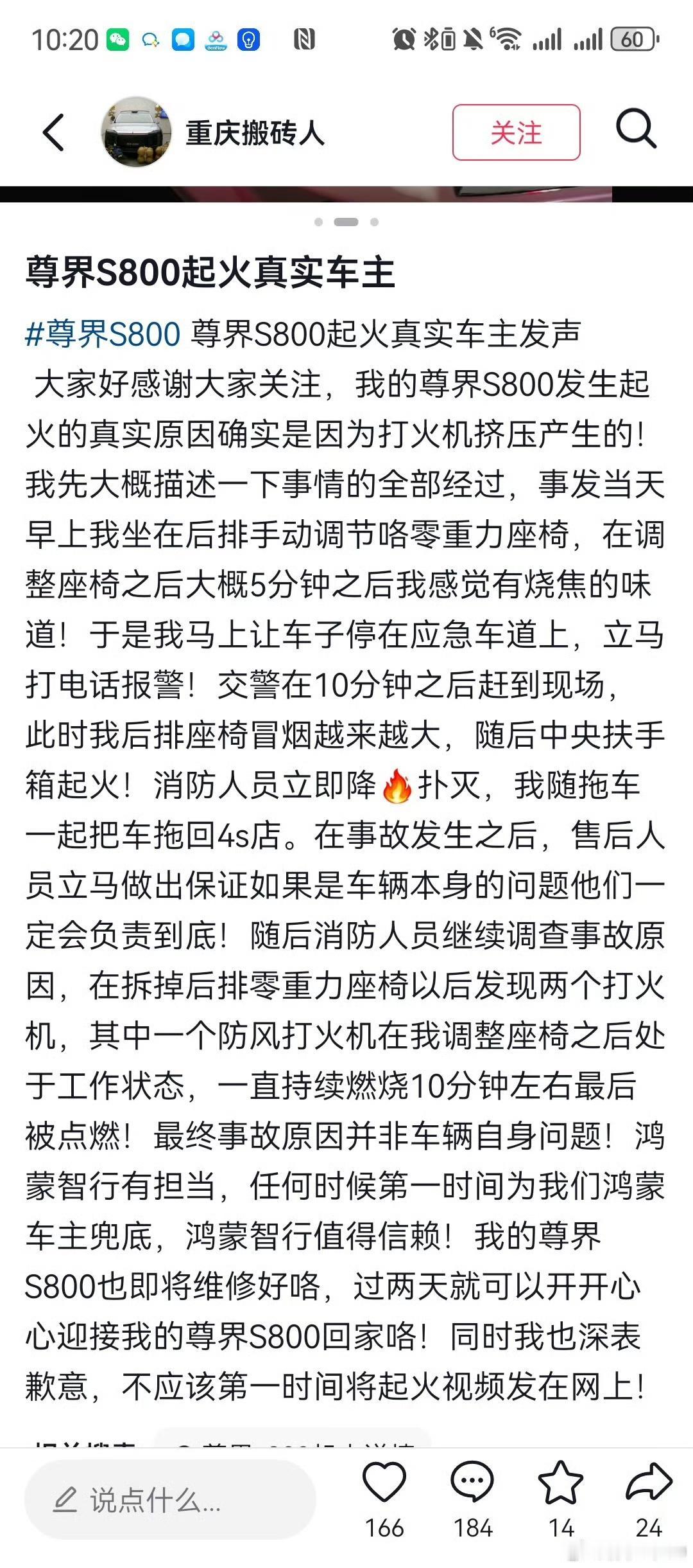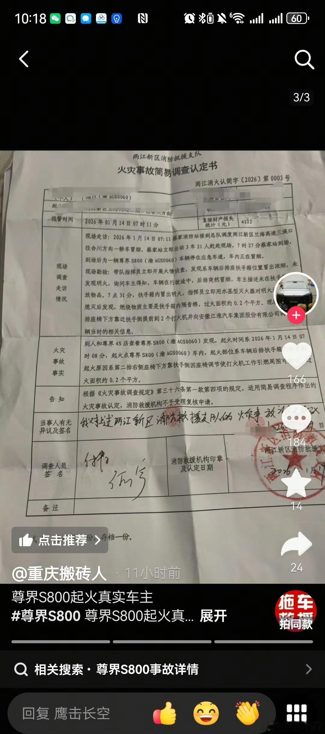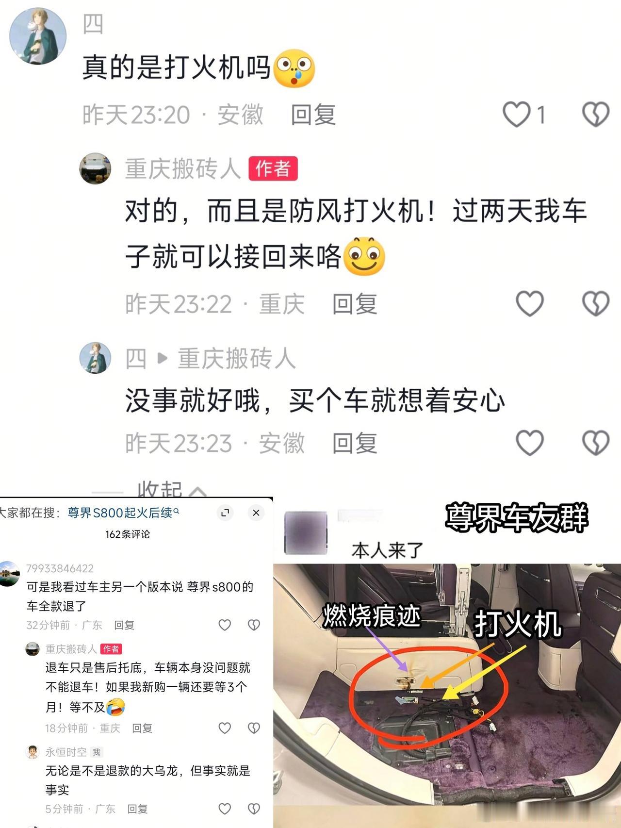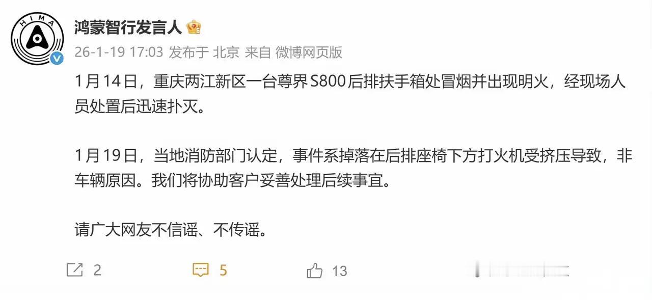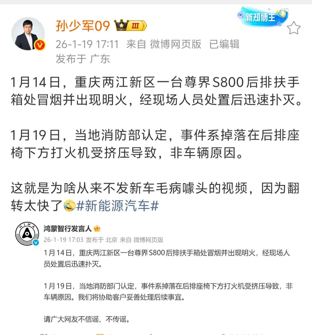 反转来得很快,那些人带的节奏反而成为尊界防火性能的有力助攻。 博主“孙少军09”说,尊界S800后排座椅起火事件当事车主已晒出消防调查认定书,明确起火原因是他自己遗落的两个防风打火机,其中一个被座椅挤压后持续工作约10分钟引燃座椅。孙少军还贴出了车主发声的截图以及消防调查认定书照片,让真相一目了然。 在尊界车主“重庆搬砖人”发布的“尊界S800起火真实车主”的发声内容中,车主详细描述了事发经过:1月14日早上,其在后排手动调节零重力座椅后约5分钟闻到烧焦味,随即停车报警;交警10分钟后到场时,后排座椅已冒烟并蔓延至中央扶手箱起火,消防人员迅速扑灭后,车辆被拖回4S店。当时鸿蒙智行售后第一时间承诺若为车辆问题将负责到底,但后续消防调查发现,座椅下有两个打火机,其中一个防风打火机因座椅调节被挤压持续燃烧约10分钟引发火情, 并非车辆自身问题。车主也坦言,此前第一时间发布起火视频的行为欠妥,对此深表歉意,同时称赞鸿蒙智行有担当,目前车辆即将修好。确认非车辆自身问题。 车主晒出的重庆两江新区消防救援支队出具的《火灾事故简易调查认定书》(两江消火认简字〔2026〕第0003号)显示,报警时间为2026年1月14日07时11分,起火车辆为尊界S800(渝AGS****),起火部位在车内后排扶手箱,起火原因系第二排右侧座椅下方靠扶手侧,因座椅调节使打火机工作引燃周围可燃物,过火面积约0.2平方米,直接财产损失4122元。认定书还注明适用简易调查程序,并有调查人员签名、消防救援机构印章及认定日期(2026年1月19日),车主也签字确认无异议。 此前,鸿蒙智行发言人同步发布声明,确认消防部门的调查结论,称将协助客户妥善处理后续事宜,并呼吁广大网友不信谣、不传谣。博主“孙少军09”看到“鸿蒙智行发言人”的声明之后发微博表示,他之所以从来不发新车毛病噱头的视频,是因为翻转太快了。 是啊,那些喷子本想借此带节奏抹黑尊界的,结果让他们失望了,不但没黑成,反而变成了强力助攻,用事实证明了尊界S800的防火性能真的不错,打火机在车上烧了10分钟才造成4122元的轻微财产损失,车辆电池更是毫发无损。华为入局智驾的鲶鱼效应 鸿蒙智行 尊界 江淮汽车 尊界S800