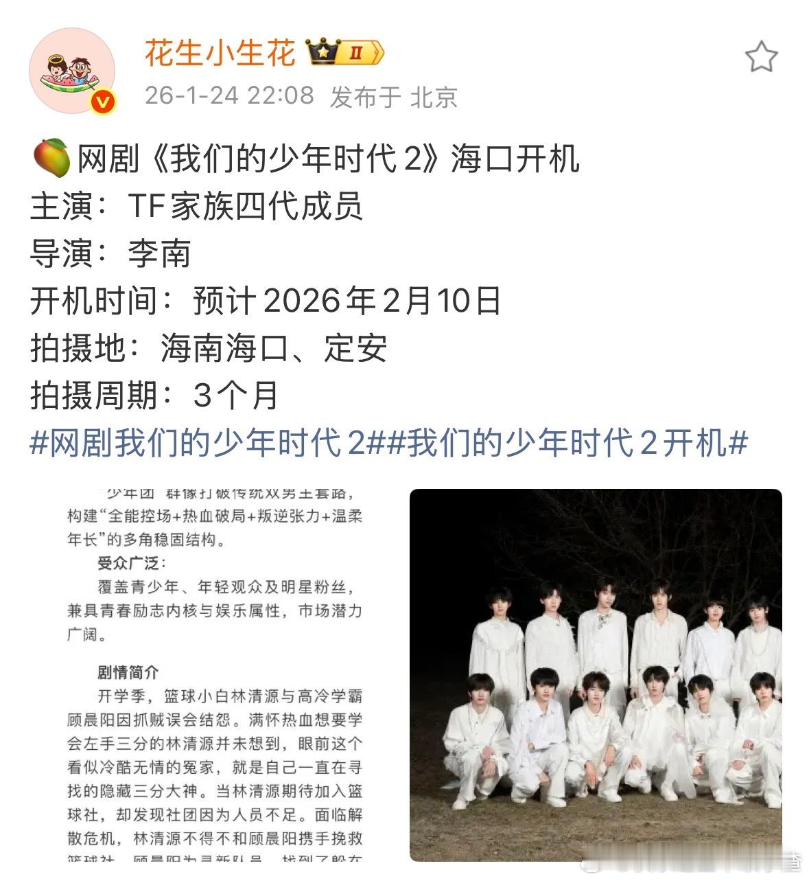 我们的少年时代2要开机了 主演是TF家族四代成员
