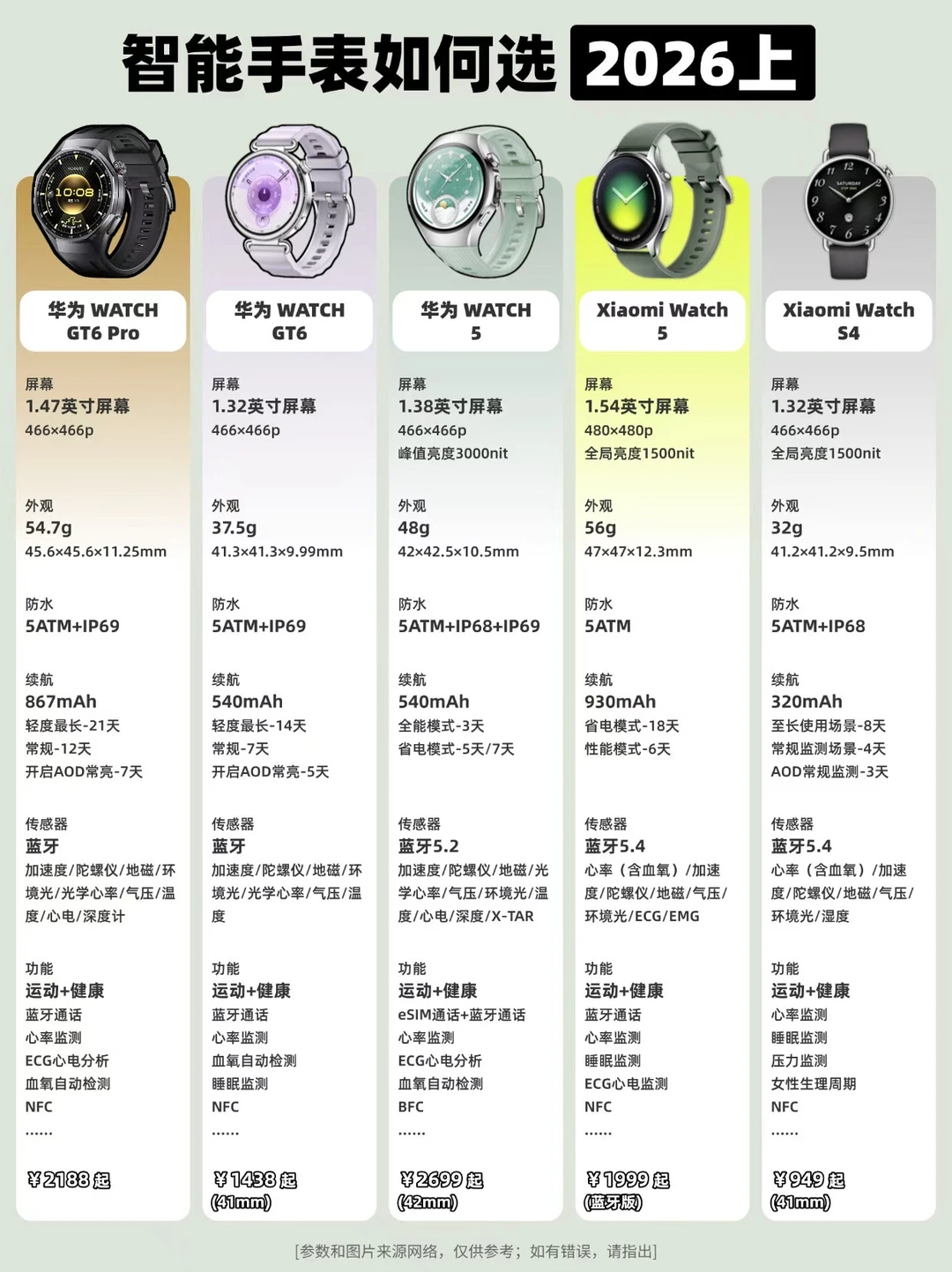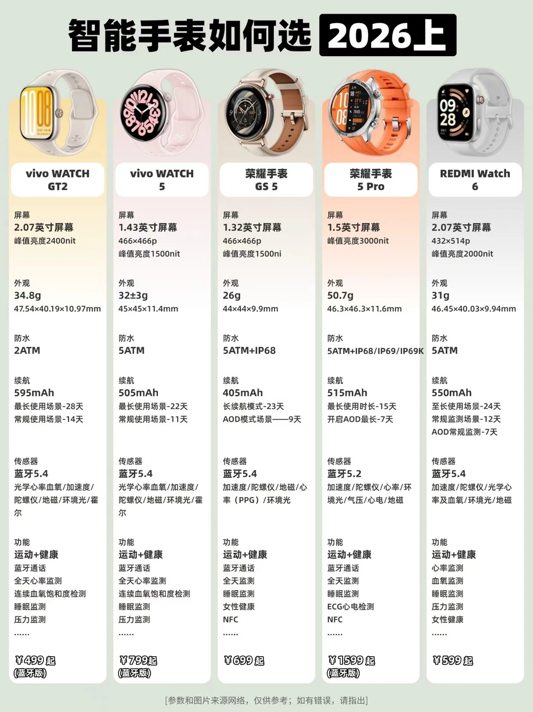 🔹预算有限:iQOO WATCH GT2、vivo WATCH GT2、红米Watch6、荣耀手表GS5等;