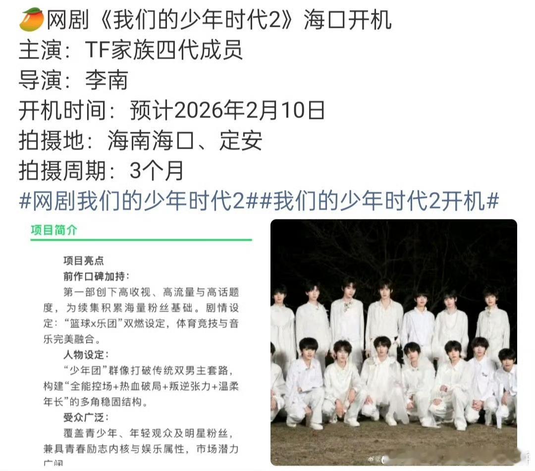 《我们的少年时代2》将在海口开机,由TF四代出演拍摄周期:3个月 开机时间:预计2月10日
