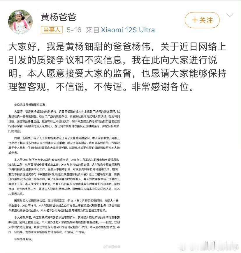黄杨钿甜父亲被立案调查。 再看她爸爸之前的回应,郑重承诺有点好笑。 最近回旋镖好忙啊!