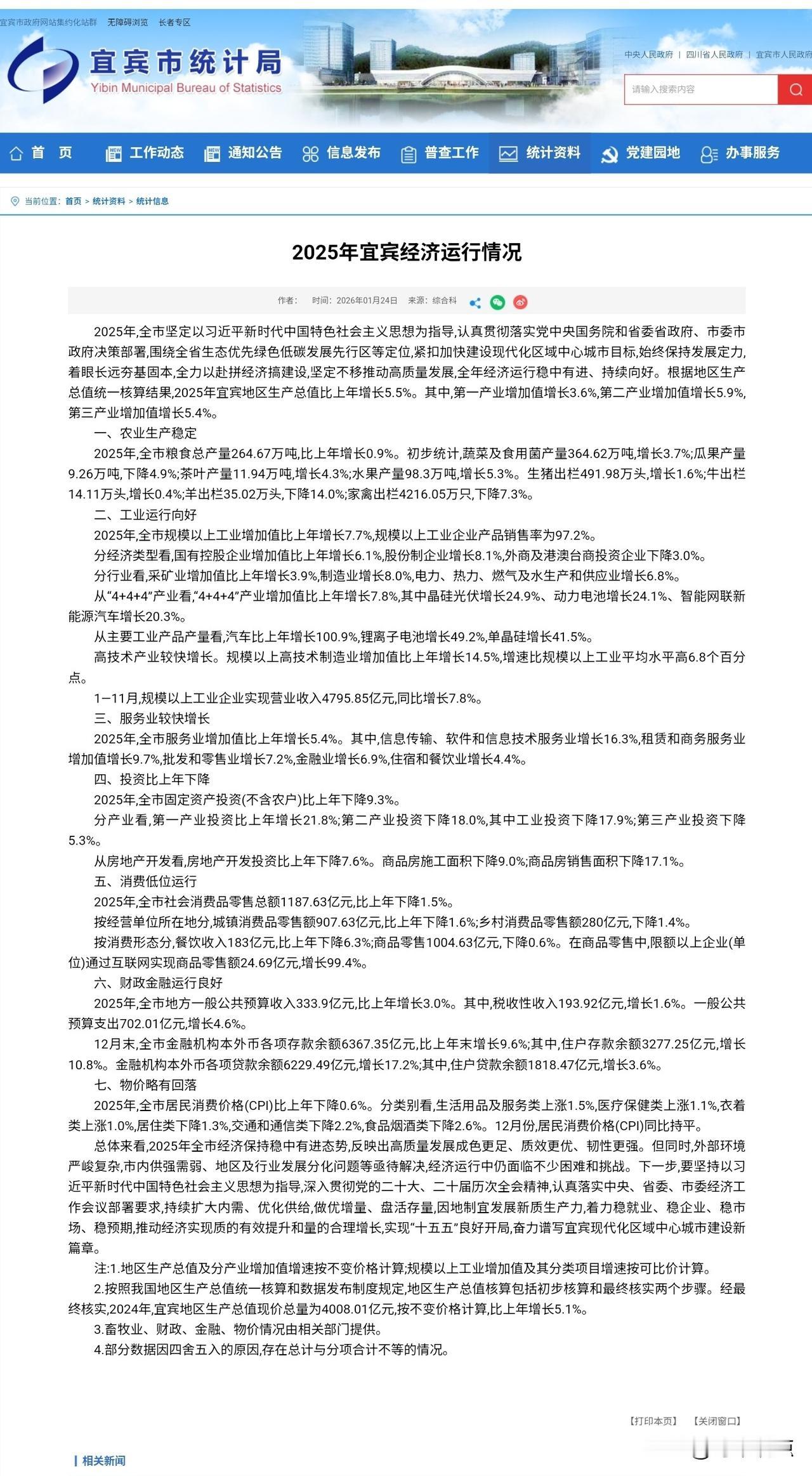宜宾 |根据地区生产总值统一核算结果,2025年宜宾地区生产总值比上年增长5.5%。其中,第一产业增加值增长3.6%,第二产业增加值增长5.9%,第三产业增加值增长5.4%。 宜宾市统计局没有公布GDP数据,按实际增长5.5%计算,宜宾市2025年,GDP为4226亿。 值得深思的是,宜宾市消费依旧乏力。2025年宜宾全市社会消费品零售总额1187.63亿元,比上年下降1.5%。2024年宜宾社消零总额为1205亿,GDP在涨,消费力却在降,这也算是‘宜宾特色’!