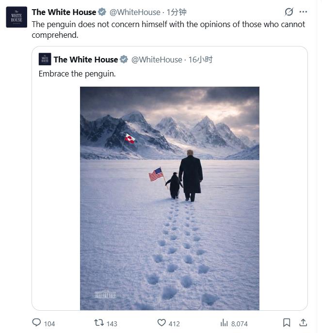 白宫回应:“企鹅并不在意那些无法理解它的人的看法”。 企鹅应在意的是身边的两脚怪和他的诡异的脚印。