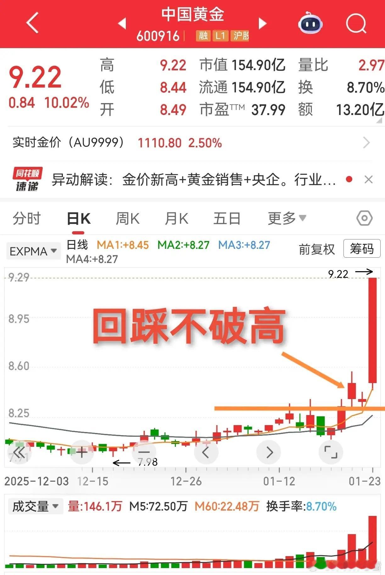 回踩不破高,芝麻节节高技术形态+板块共振,选股胜率直接拉满!黄金板块全线走高,四川黄金领涨翻倍,中国黄金紧跟节奏:缩量回踩不跌破前高,分时回踩稳守均线,周五涨停完美验证逻辑 盘口细节藏乾坤,懂的自然懂。