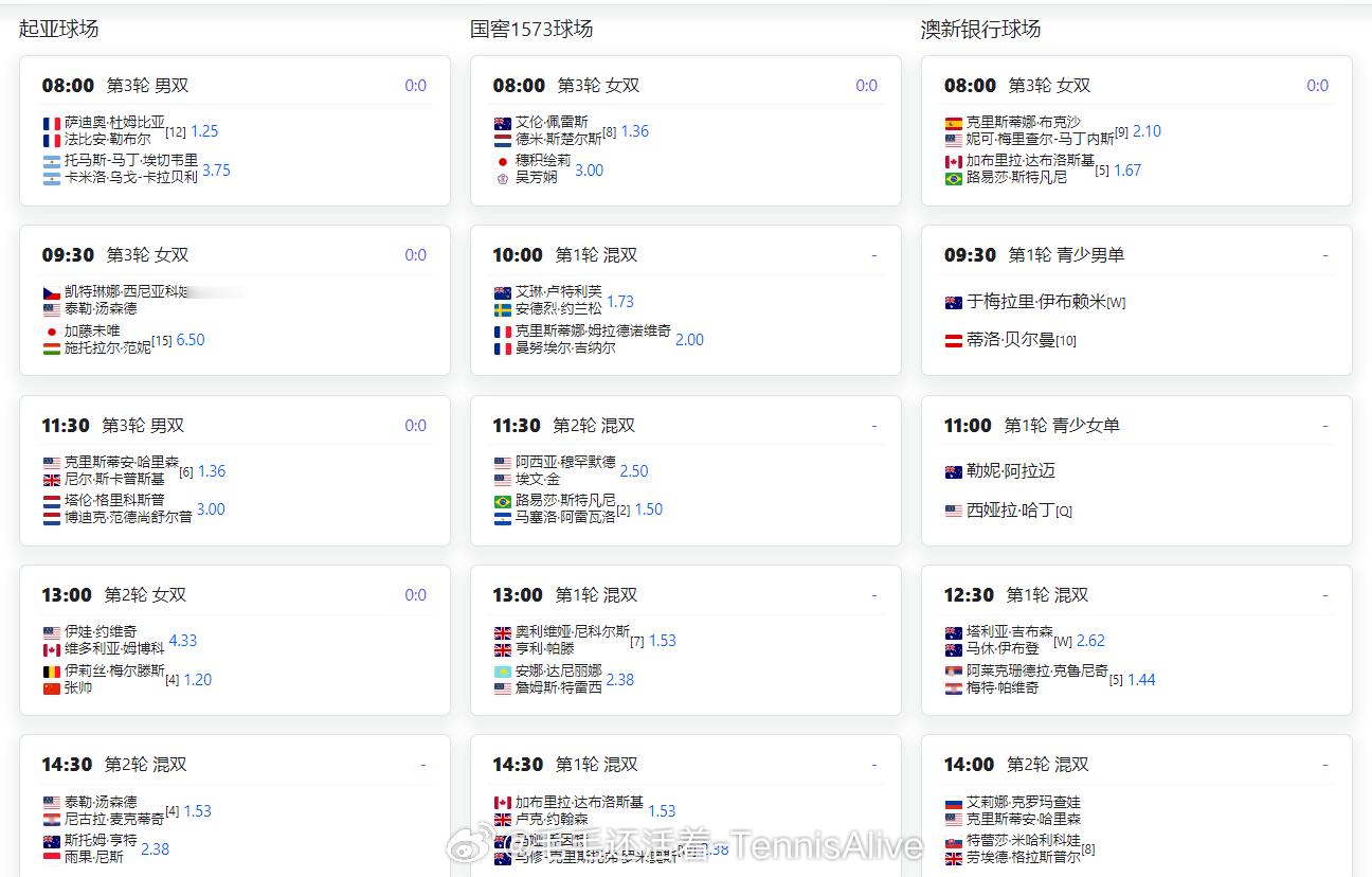 【1月25日澳网第8日比赛赛程+直播赛程】8:30萨巴伦卡vs姆博科(中央)10:00普丁塞娃vs约维奇(凯因)10:30阿尔卡拉斯vs保罗(中央)12:00高芙vs穆霍娃(考特)14:00梅德韦杰夫vs勒纳钱(考特)14:00张帅女双第二轮(起亚)16:00布勃利克vs德米纳尔(中央)18:30斯维托丽娜vs安德列娃(中央)这很澳网澳网2026