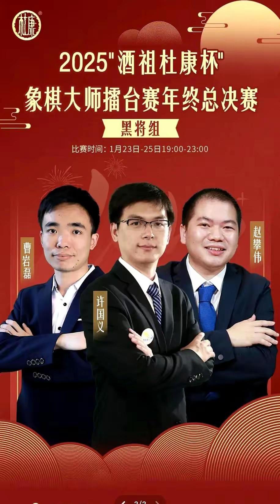 杜康杯黑将组第二天的比赛精彩纷呈,第一战赵攀伟的弃子战,水平是不如曹岩磊的弃子战,曹岩磊的弃子大师水平是真强。 第二战许国义战胜曹岩磊, 第三战赵攀伟胜许国义,三个人再次各胜一场。 赵攀伟仍然占先,具体结局,今天晚上定胜负。