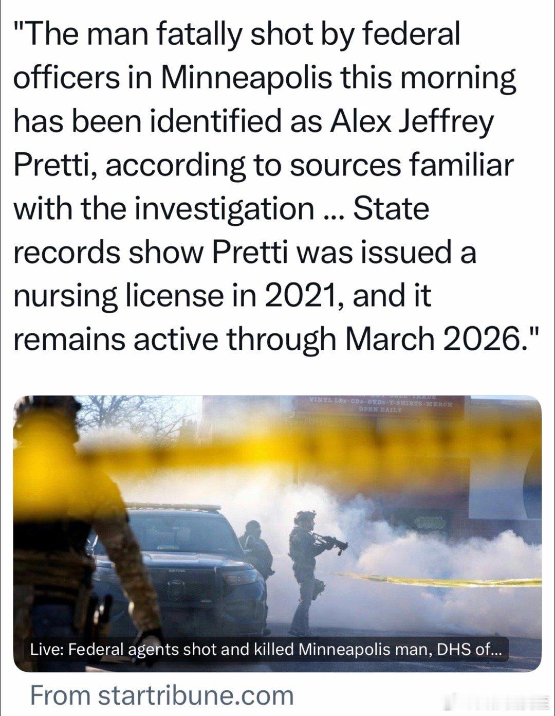 联邦移民执法在明尼阿波利斯枪杀第二名抗议者:37岁白人男性、美国公民、军医院ICU护士他阻挡ICE推搡一位女性抗议者,被ICE喷辣椒雾、摔倒跪地,ICE掀起他的上衣,发现腰上有枪,夺下、拿走、后退,另一ICE朝他开枪、后退、继续开枪,一共四到五枪,抢救无效死亡当地警方核实:他是合法居民、有合法持枪证