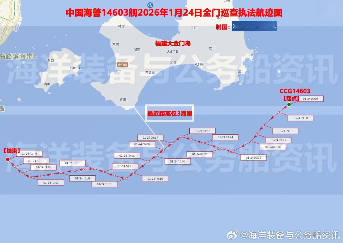 福建海警位金门附近海域开展常态执法巡查 【海警】2026年1月24日上午9:00-11:00,福建海警局所属由中国海警14603舰、中国海警14605舰、中国海警14529艇和中国海警14533艇组成的舰艇编队位我福建省金门岛南侧海域开展常态化执法巡查(2026年第4次)。中国海警在行动中国海警执法 【详情点击】 网页链接